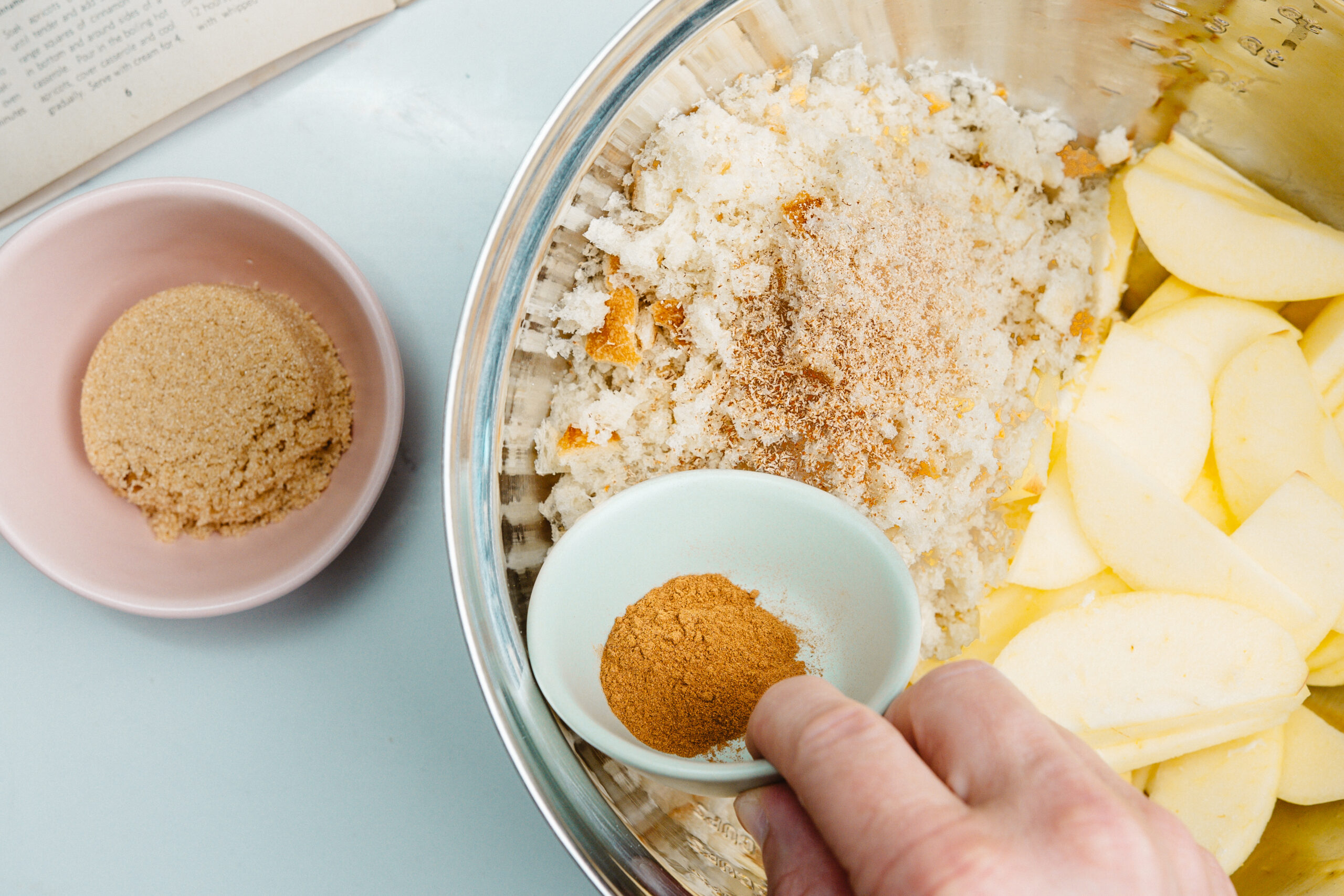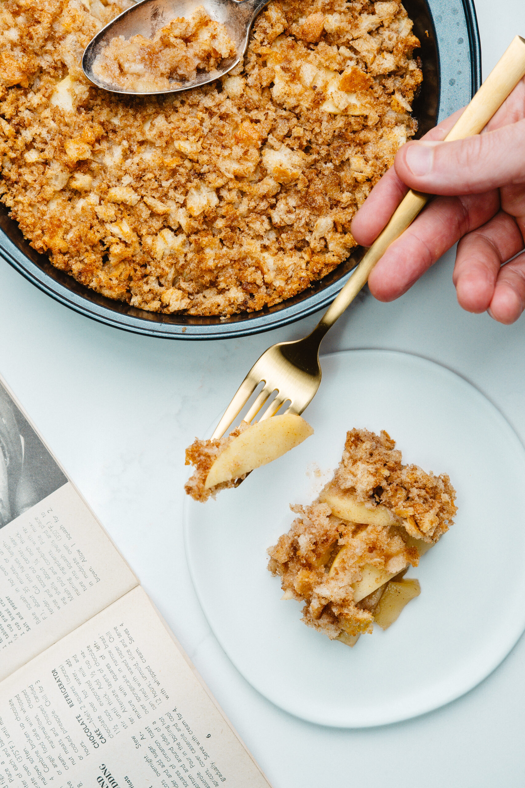 Toss into your oven and allow to bake for about 30 minutes or until the crumb is toasty, the apples are cooked and then remove, allowing to cool gently for about 10-15 minutes.