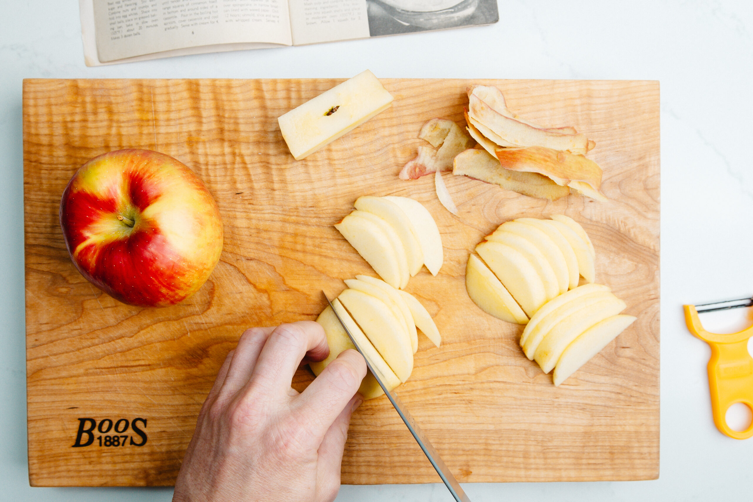 Slice your apples into rustic chunks or slices of your desired size. The thicker the cut, the longer the cooking time will require, but it’s all about your aesthetic for the final result.