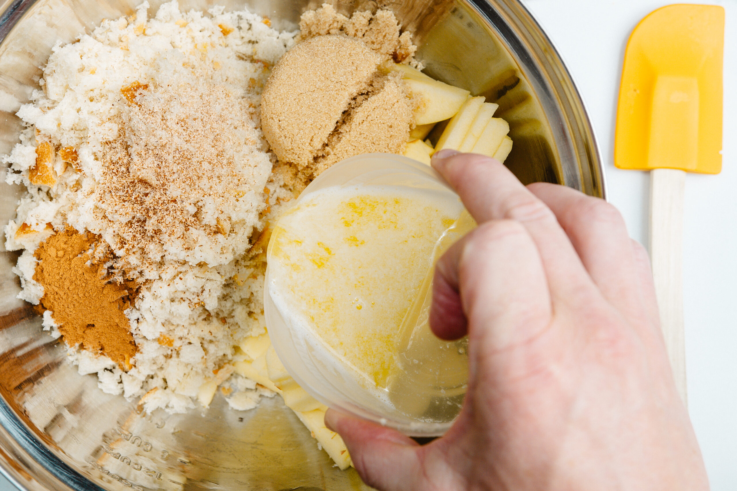 Mix your sliced apples in a mixing bowl with your bread crumbs, brown sugar and your cinnamon. Toss everything around for a minute to ensure it’s evenly mixed. Then add to a baking dish of your choice, adding your water and melted butter.