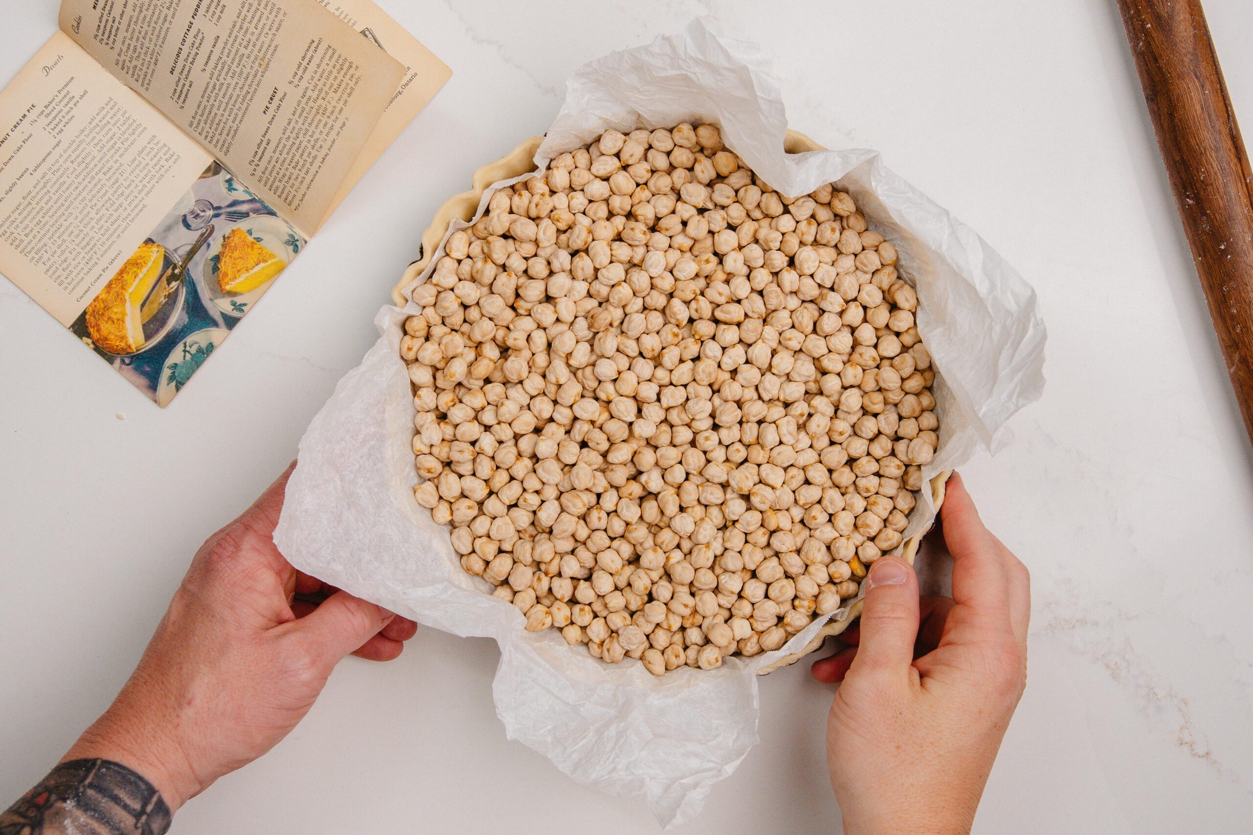 While that’s cooling, blind bake a pie shell with a bag of dried chickpeas and crushed parchment paper for about 12 minutes.