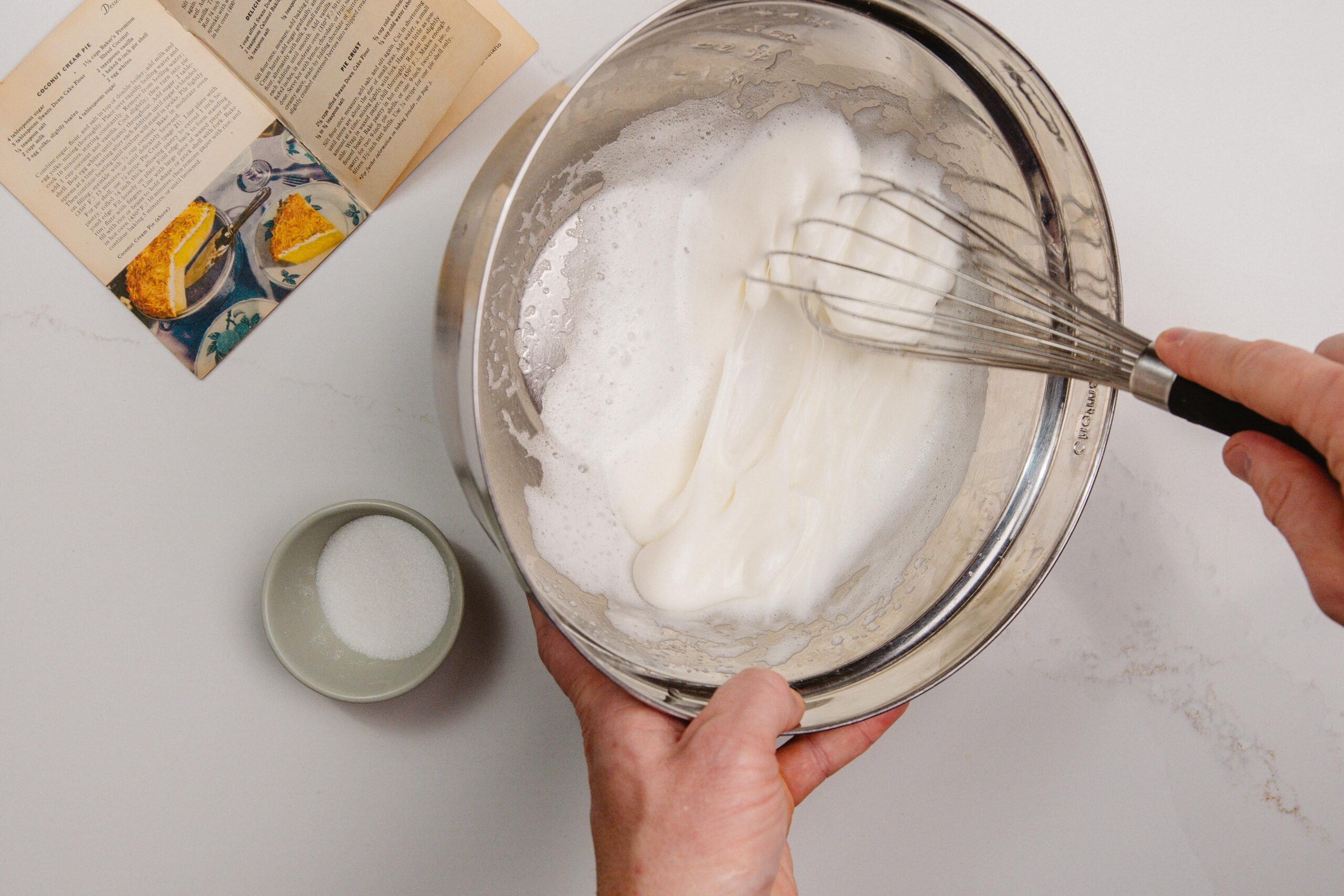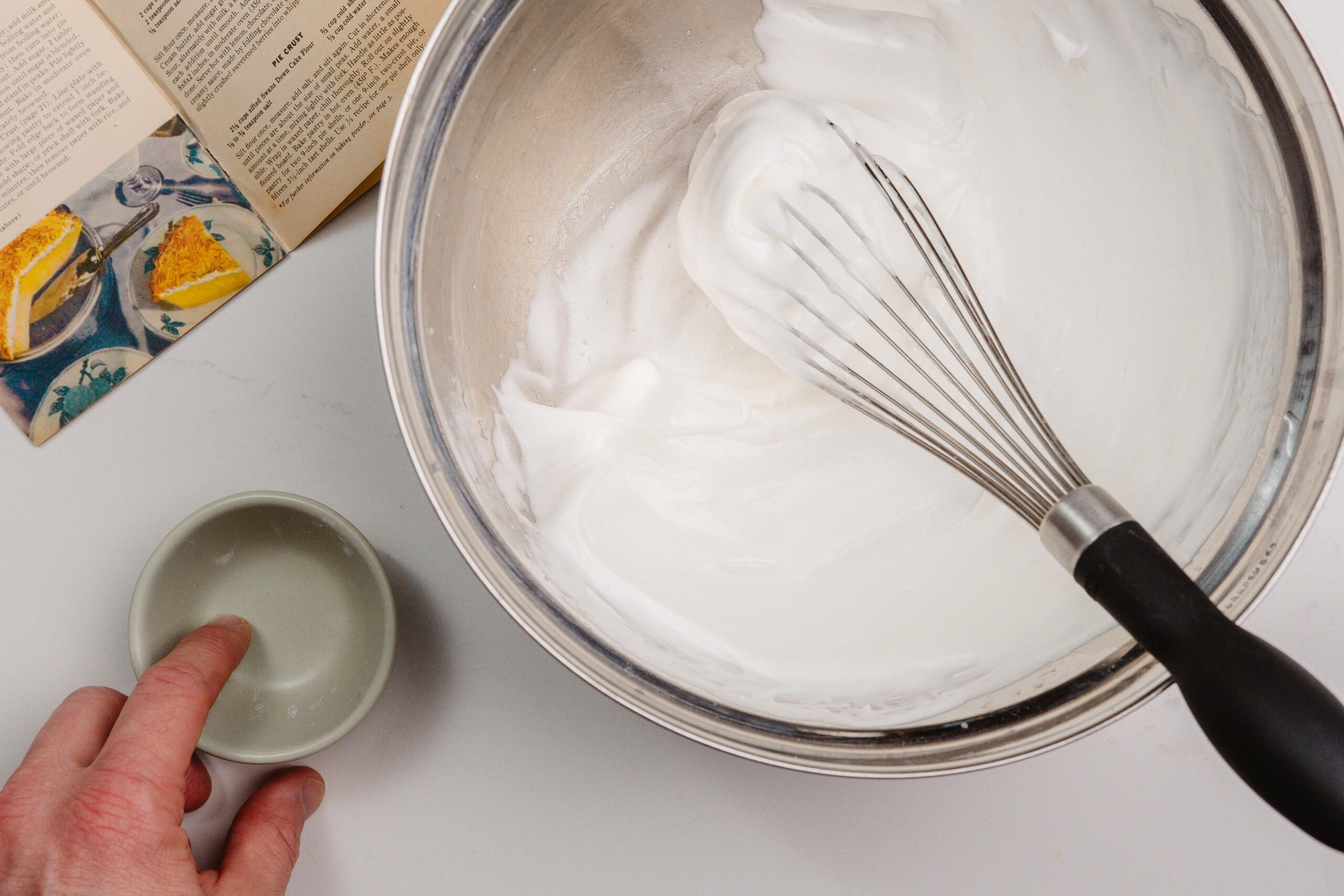 While that’s baking, you can whip together your egg whites until they are foamy and aerated, spooning in the sugar a little at a time until it’s fully incorporated. After about 5 minutes of whisking, your egg whites will begin to form silky ribbons of meringue – keep going until they can hold their shape. Congratulations! You just made French Meringue!