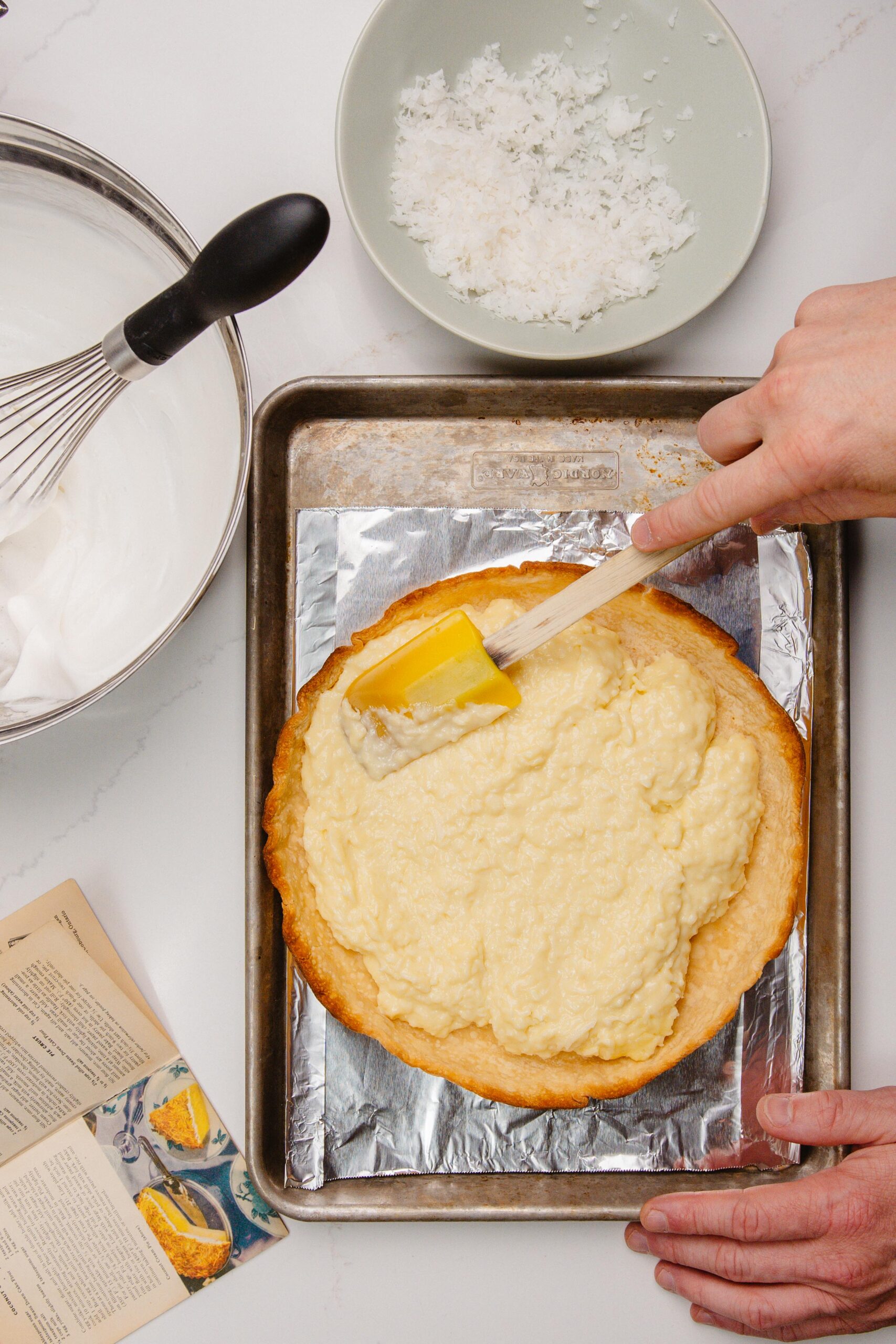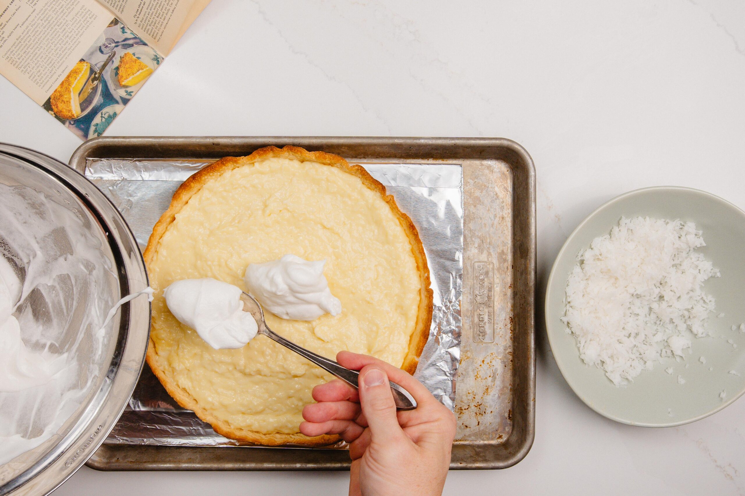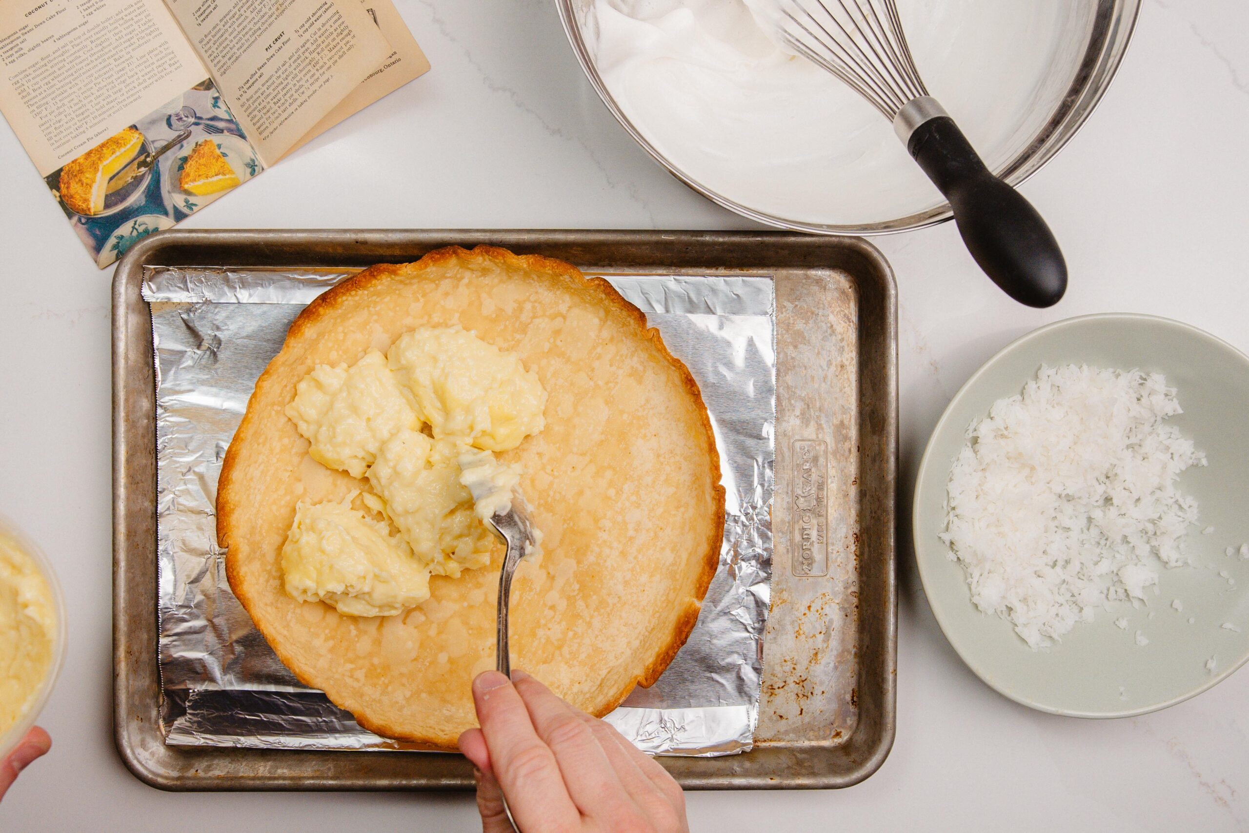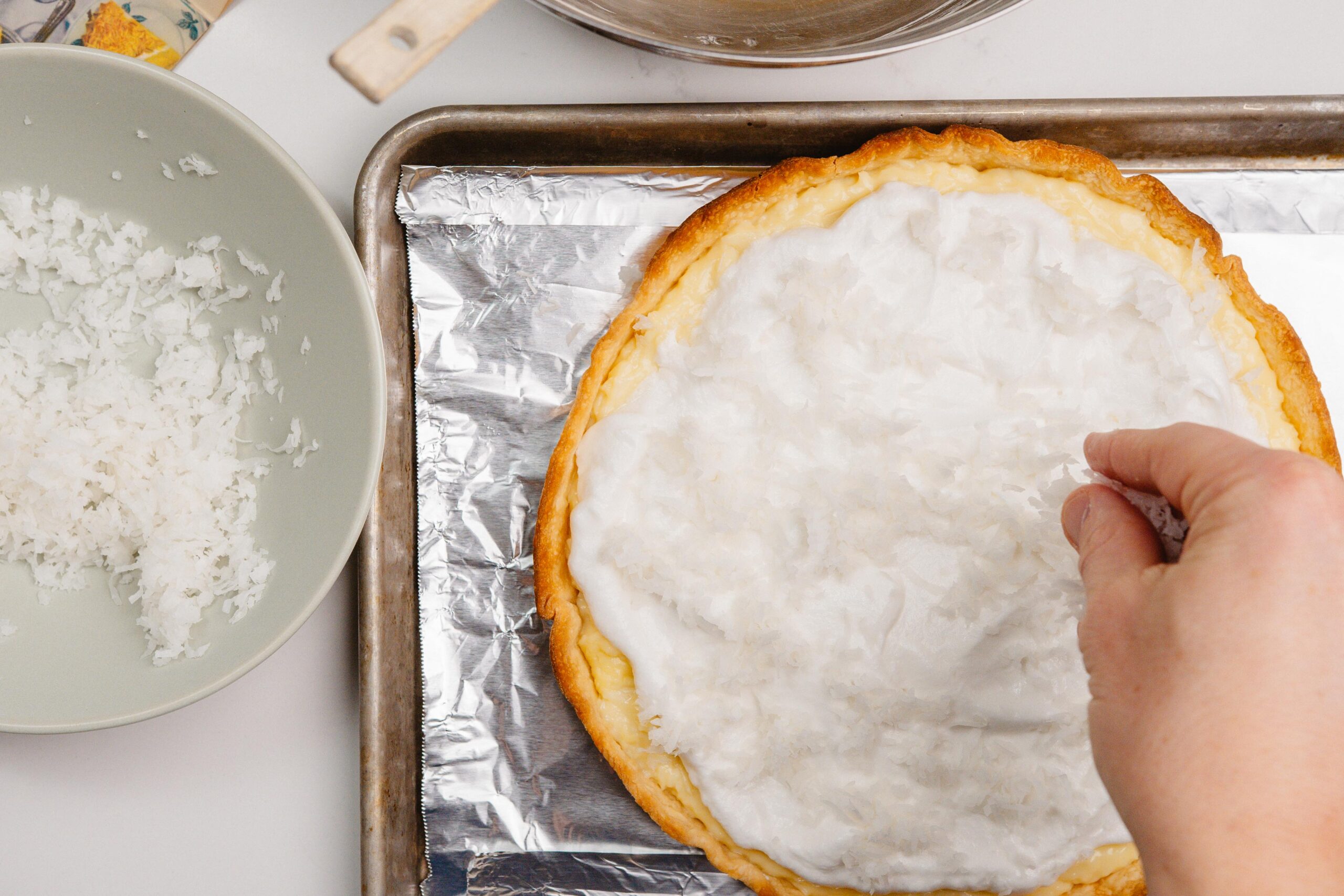 When your shell and custard are cool enough, spoon and level your Coconut Cream filling in the pie shell and then top with the whipped French Meringue and the remaining shaved coconut flakes.