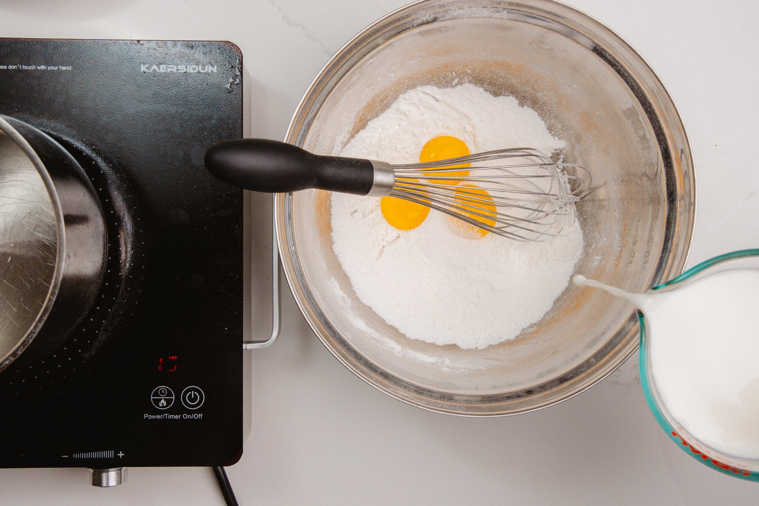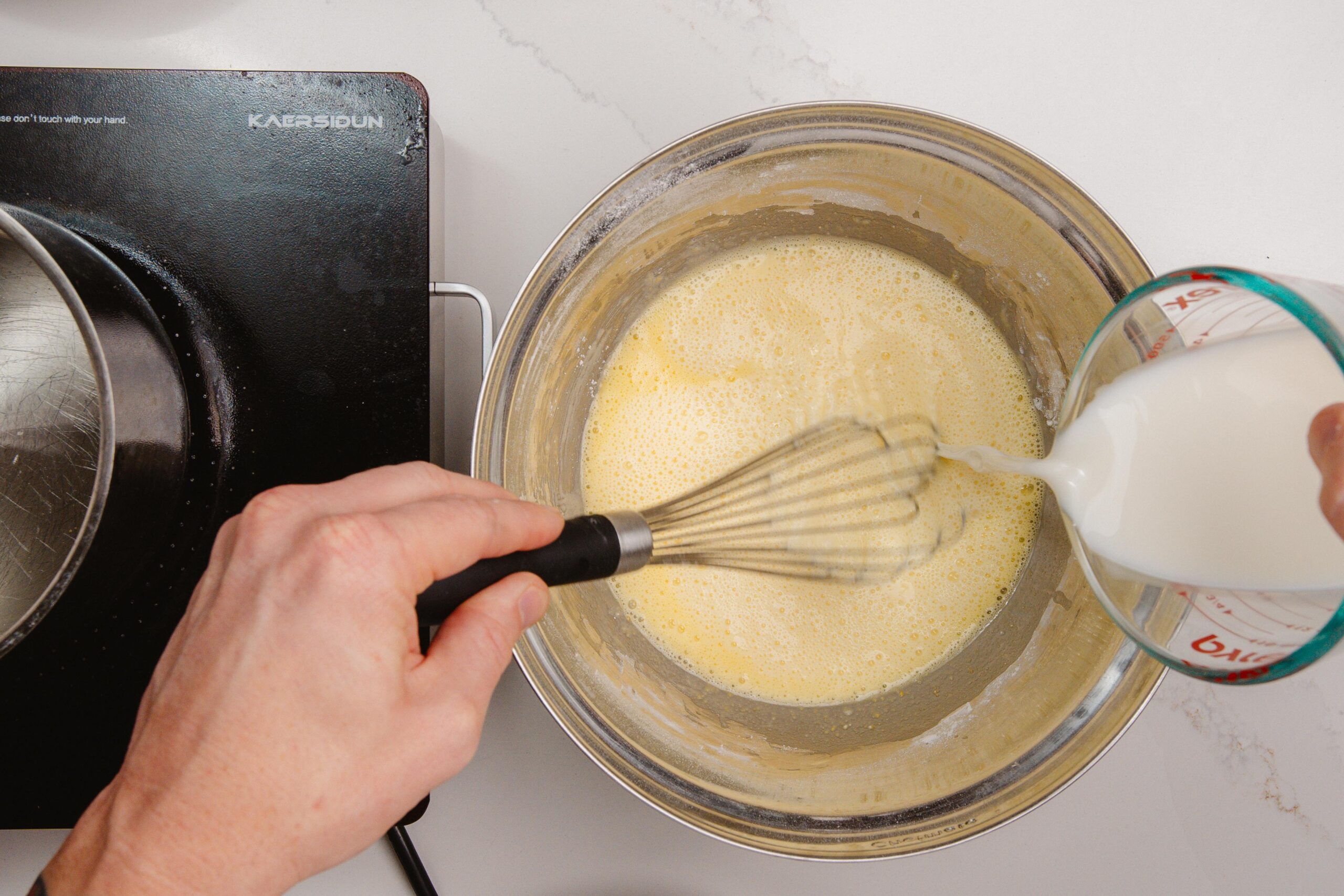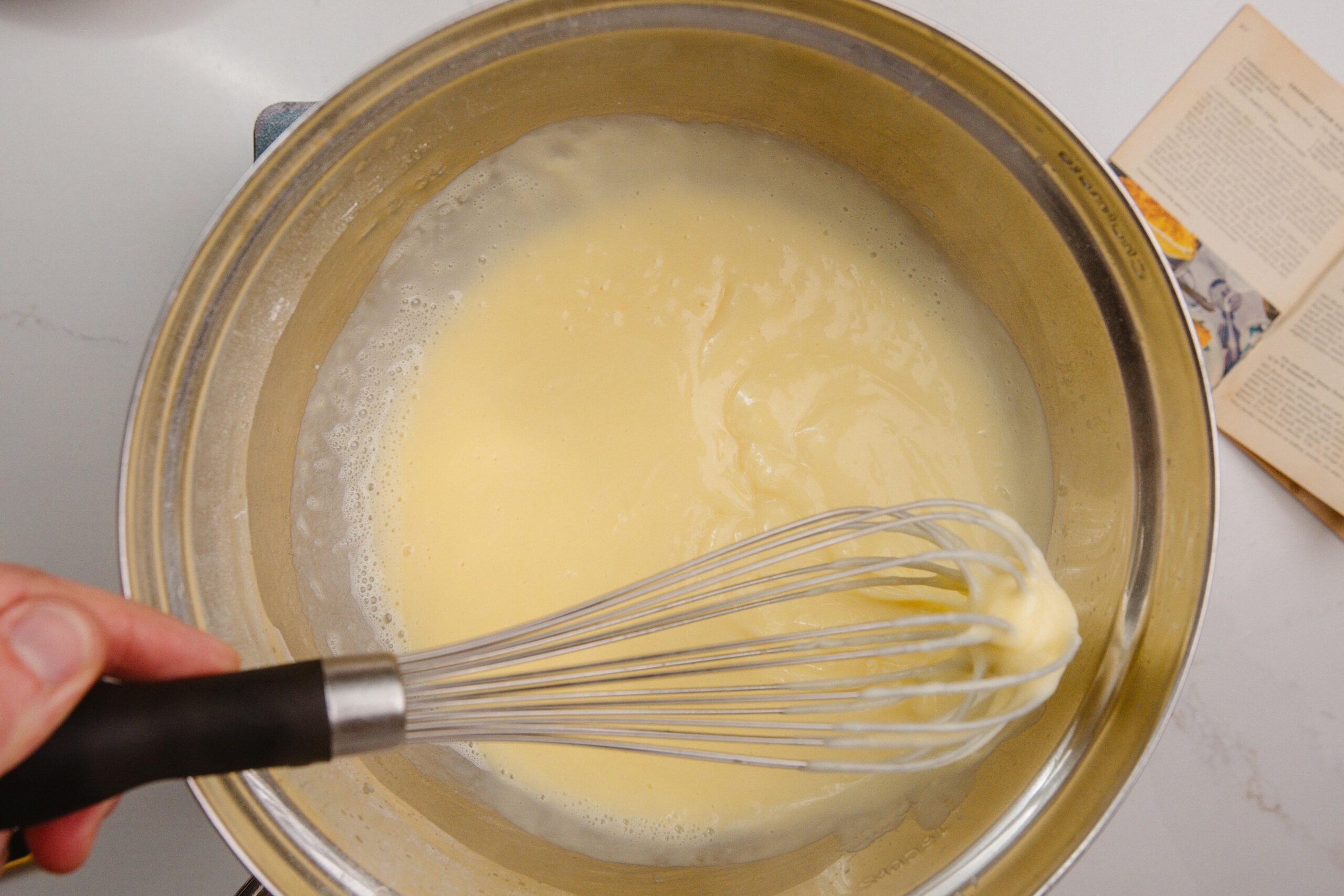 When everything is combined, add your egg yolks and milk and place the metal mixing bowl on top of a pot of boiling water, like a Bain Marie or Double Boiler. Continue to whisk for about 10 minutes and you’ll find the liquid will become airy, and eventually will begin to thicken as it heats.