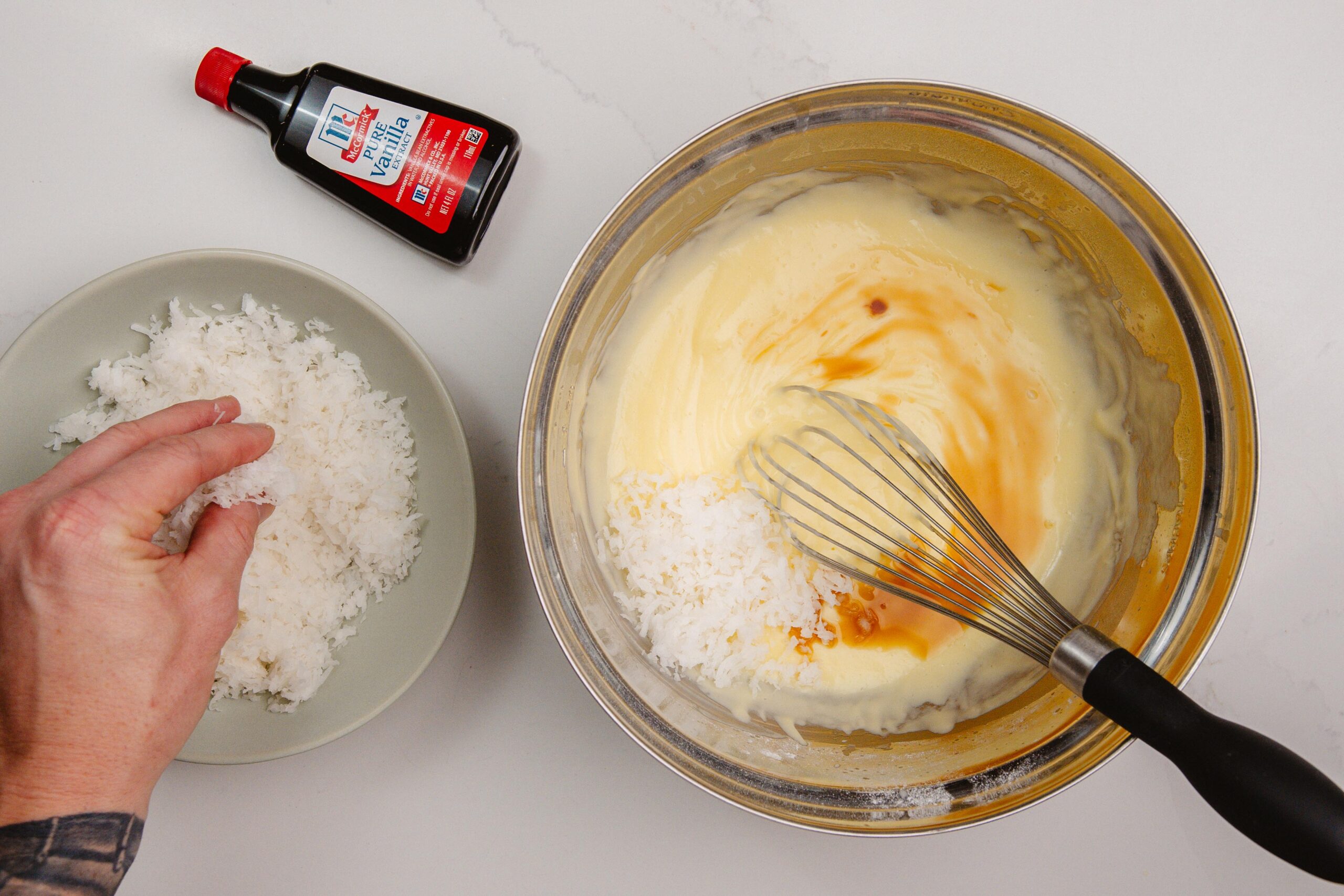 Add 1 cup of coconut flakes and your vanilla extract to the custard base and allow to cool on the counter or in your fridge.