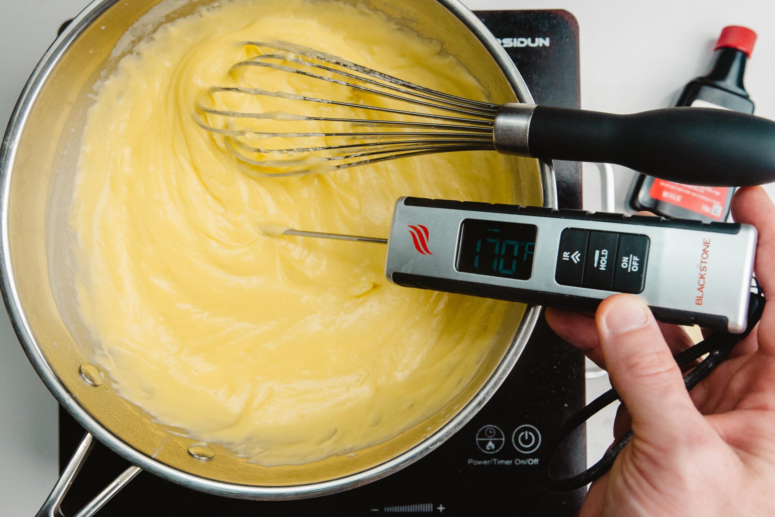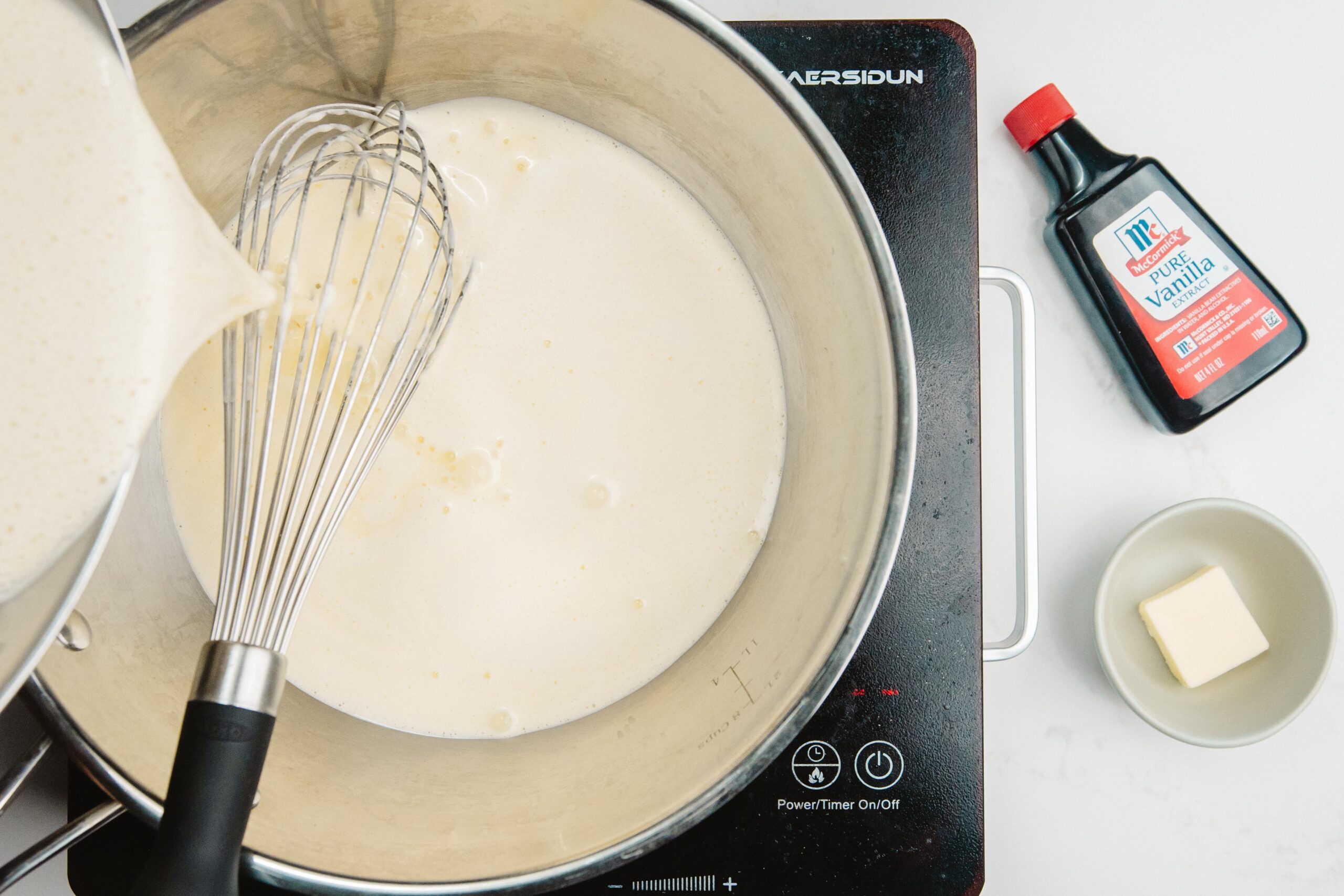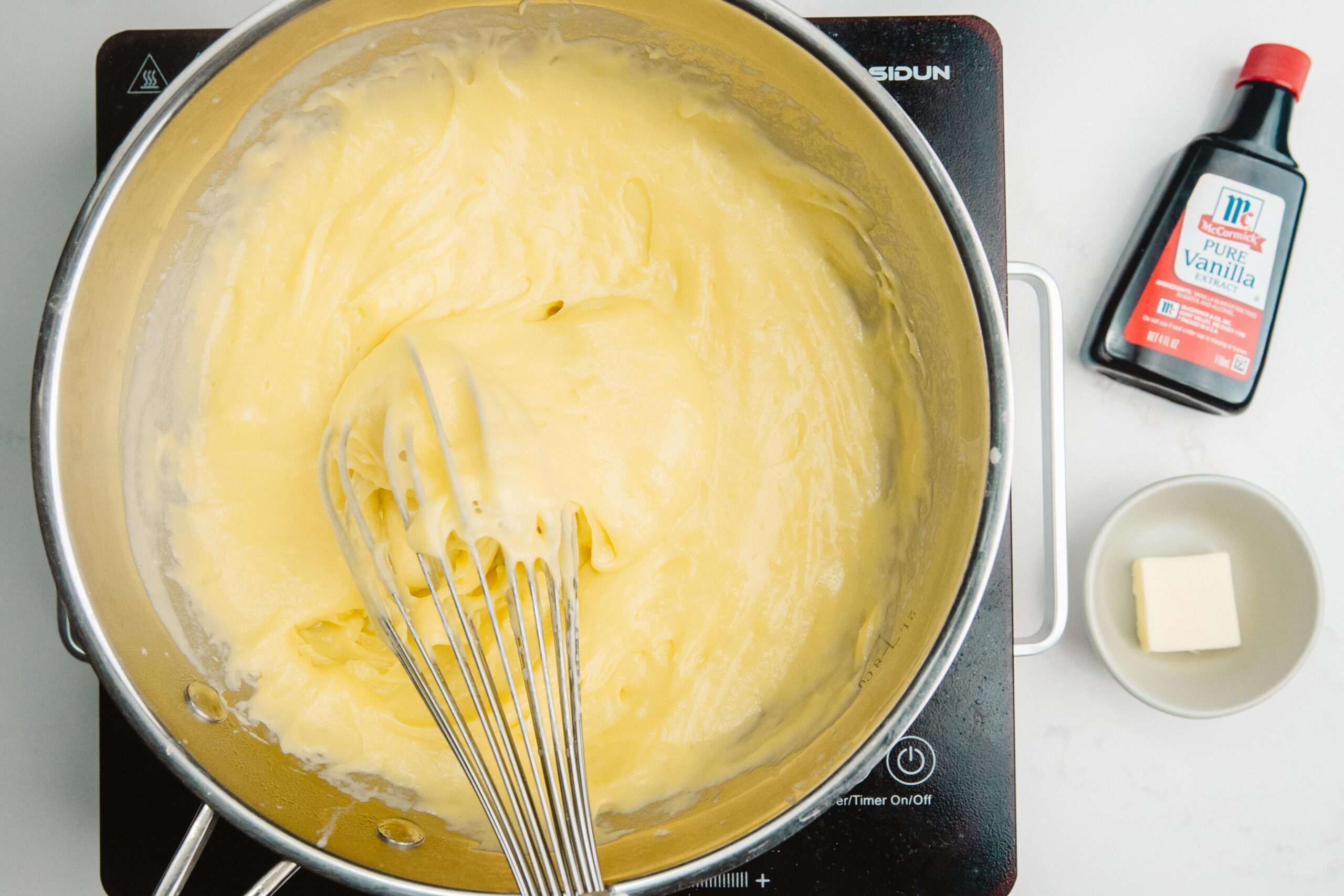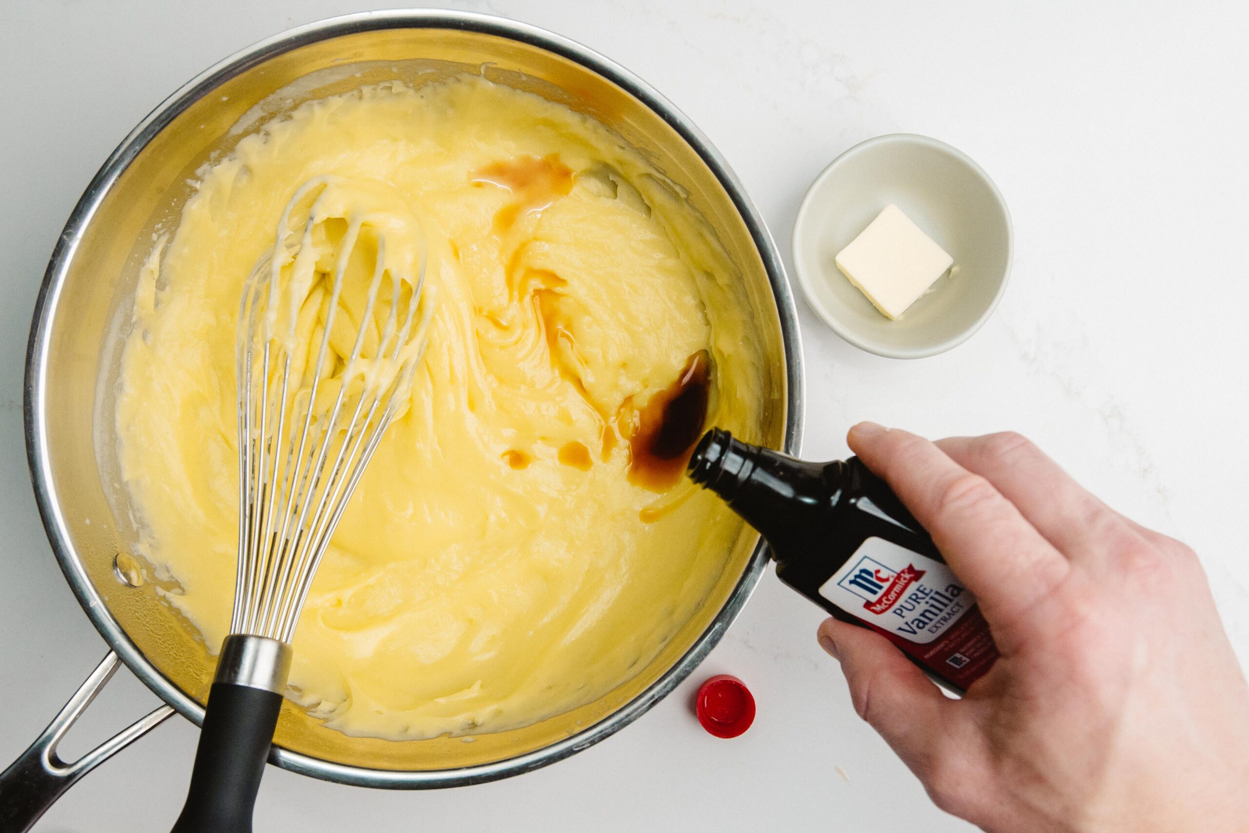 Remove from the heat and then add in your cold butter and flavoring, whisking until fully incorporated. If you are not using immediately, dot the surface with softened butter, which will melt and protect your custard from drying out.