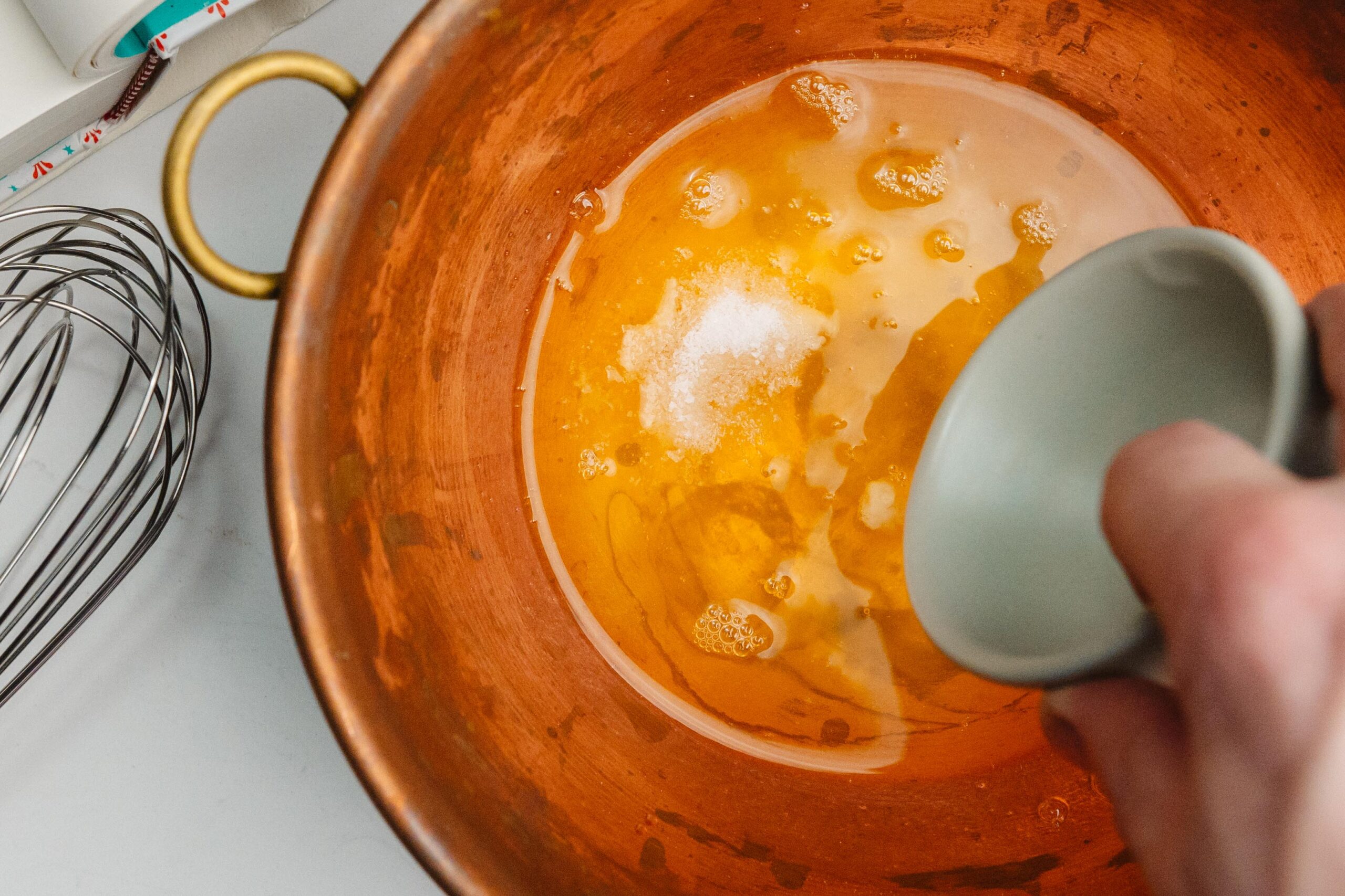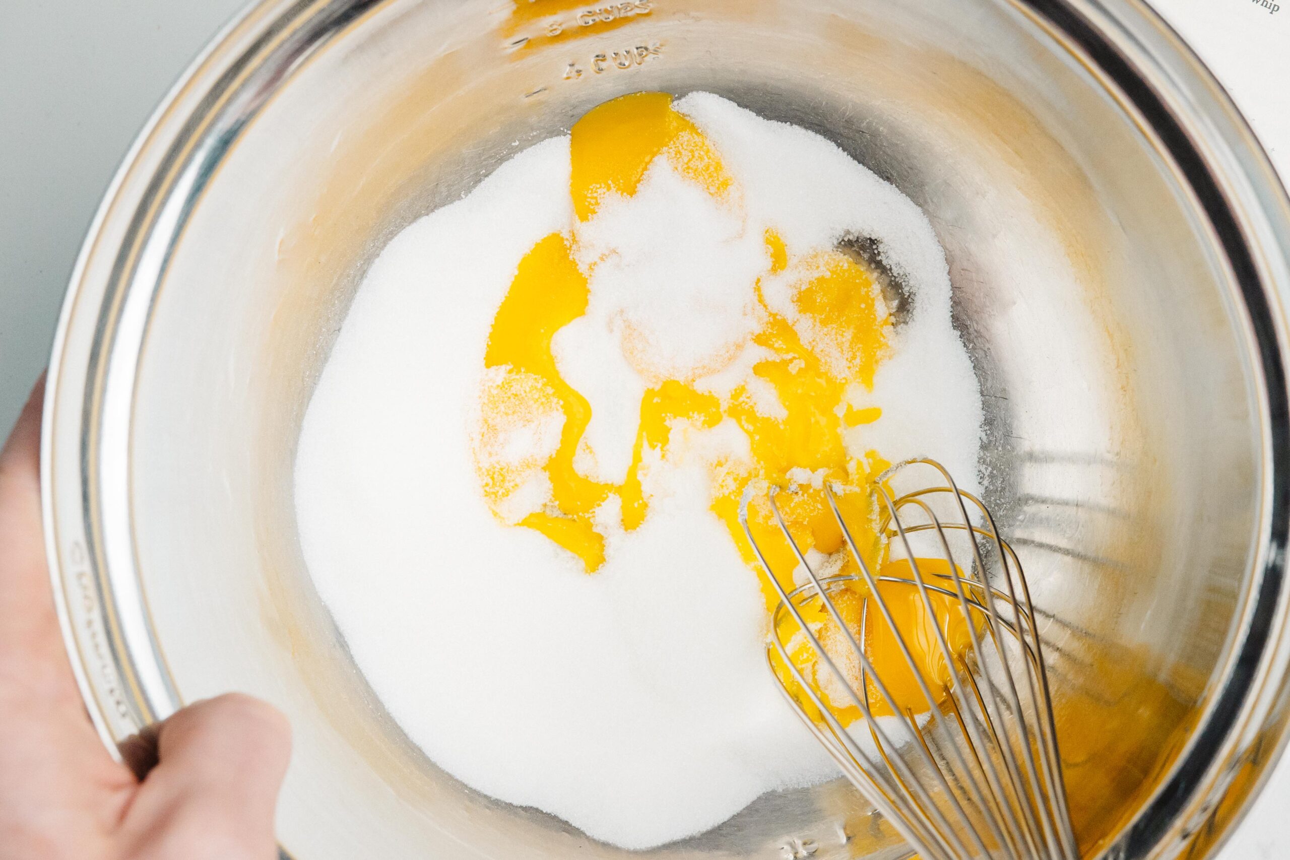 Whisk together your egg yolks with the sugar by hand or using an electric mixer until you’ve reached the Ribbon Stage (about 3-4 minutes). The batter will be a silky pale yellow color.