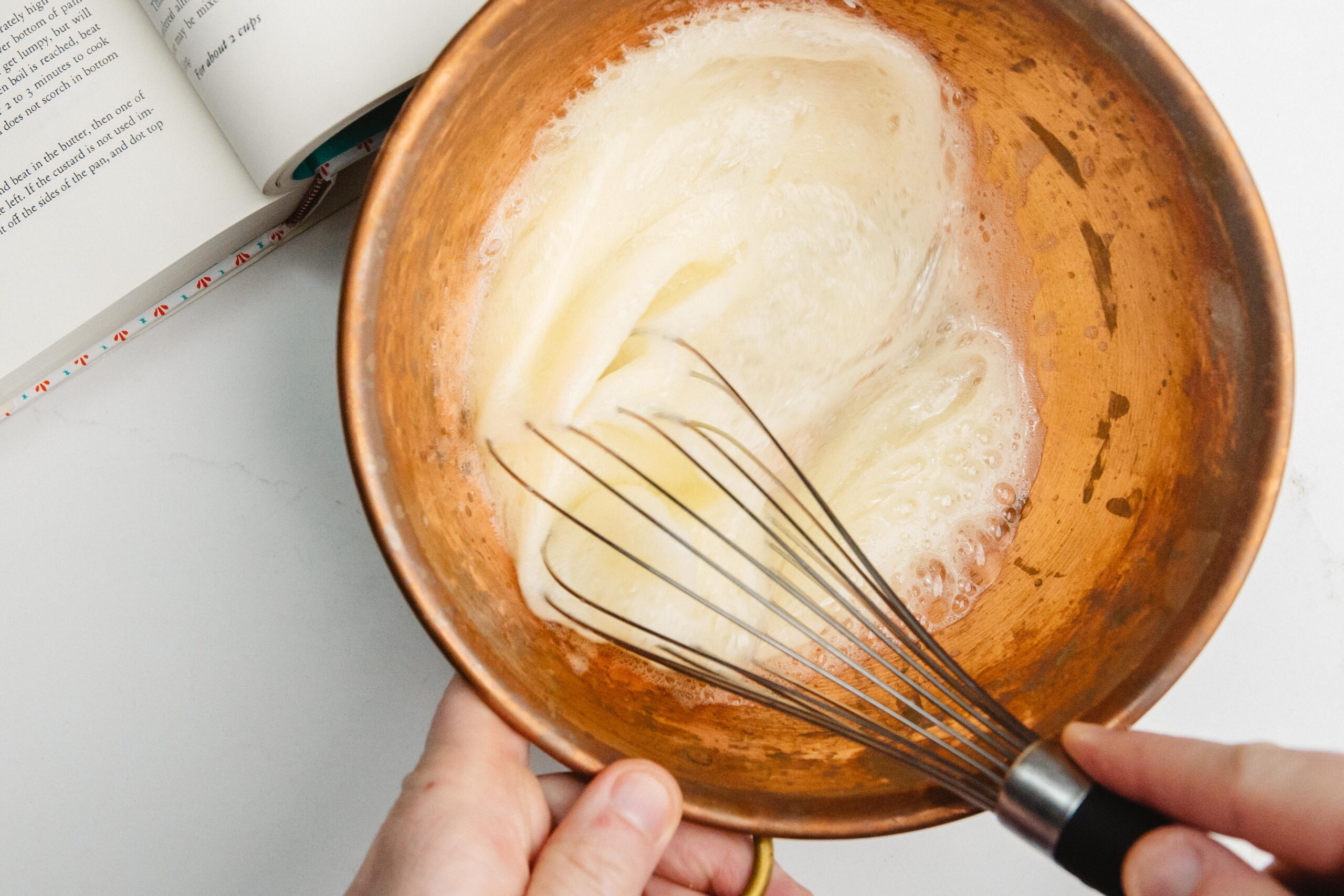 Beat in your flour until fully incorporated and then, gradually, add the hot milk a little a time, so you don’t cook the egg yolks.