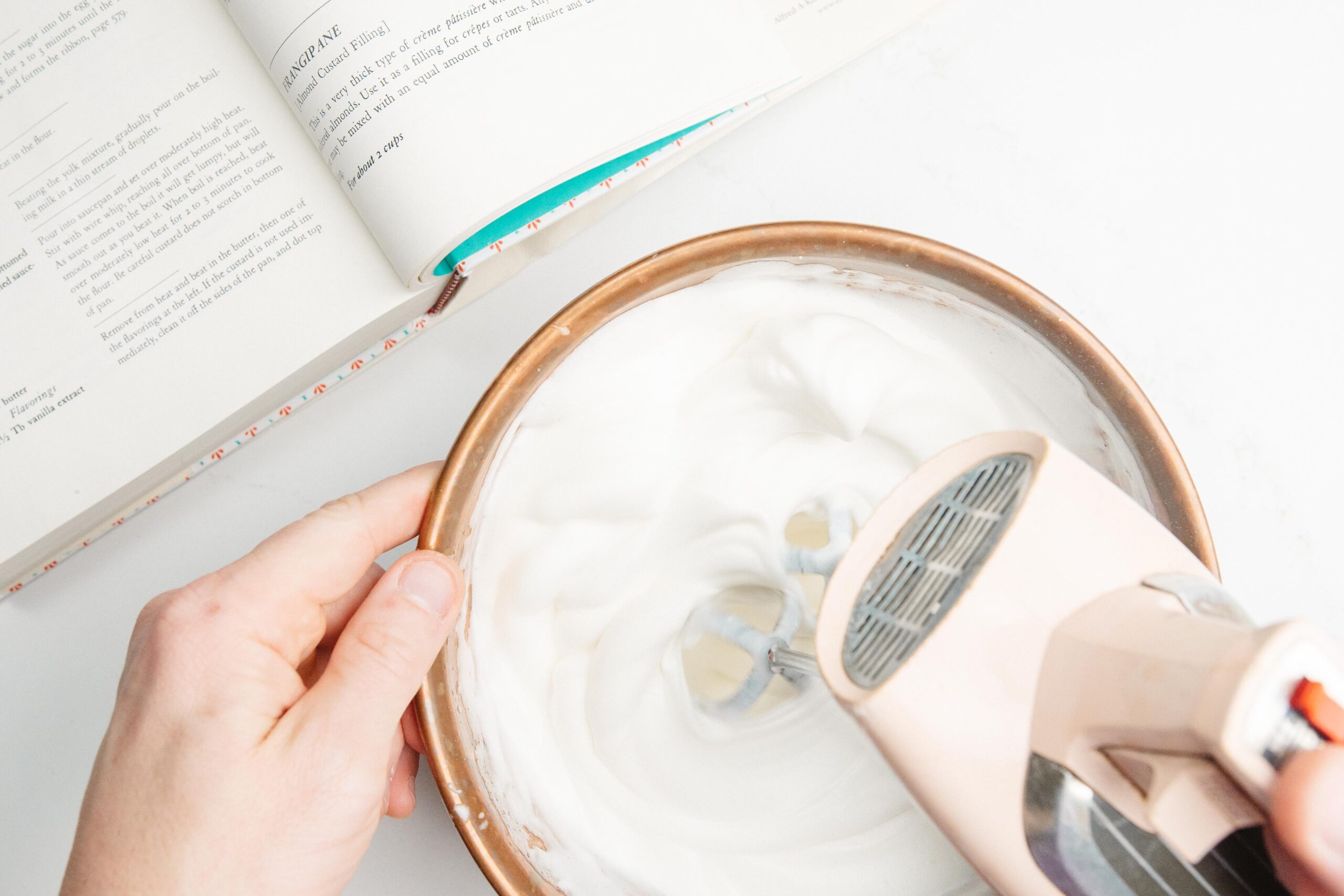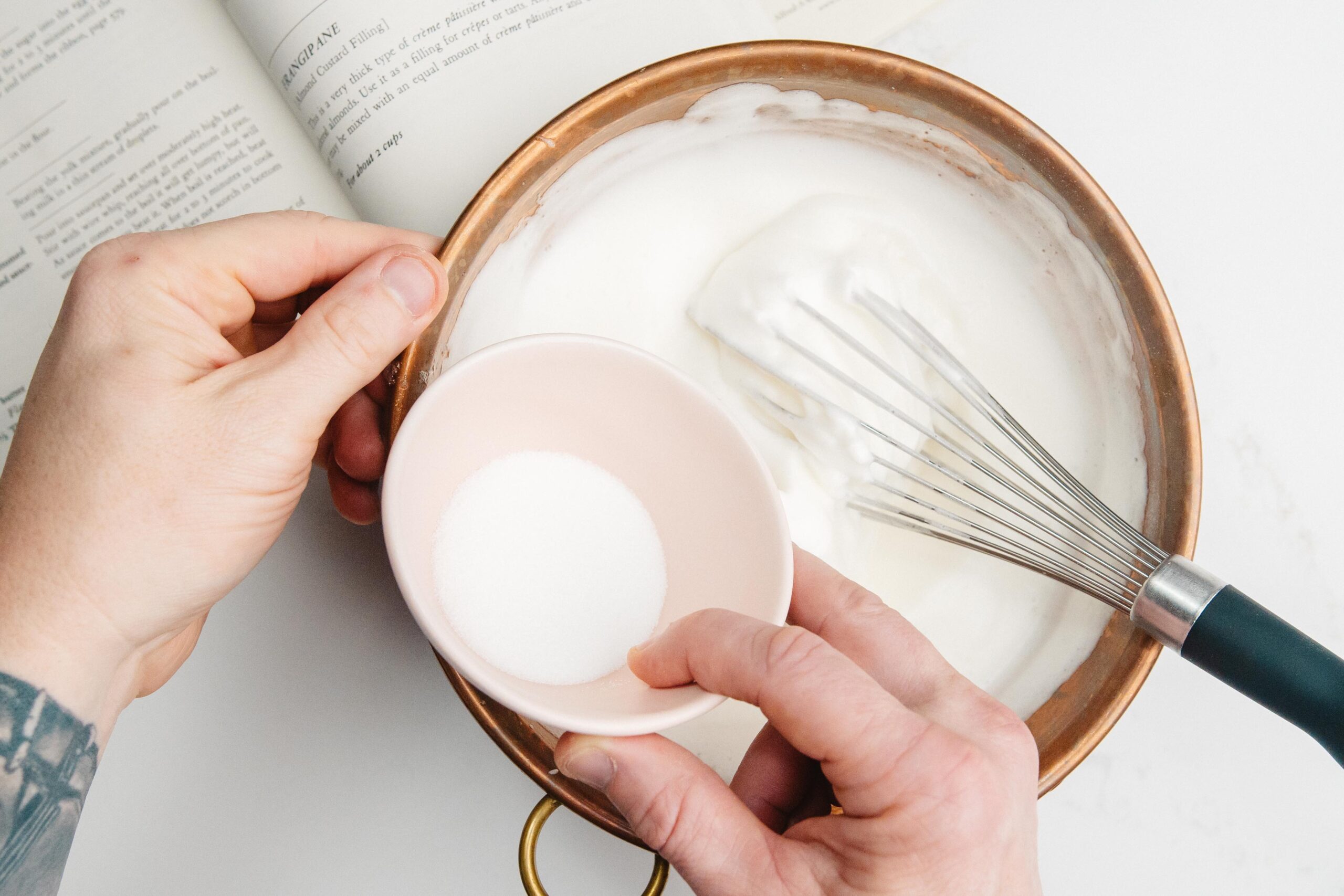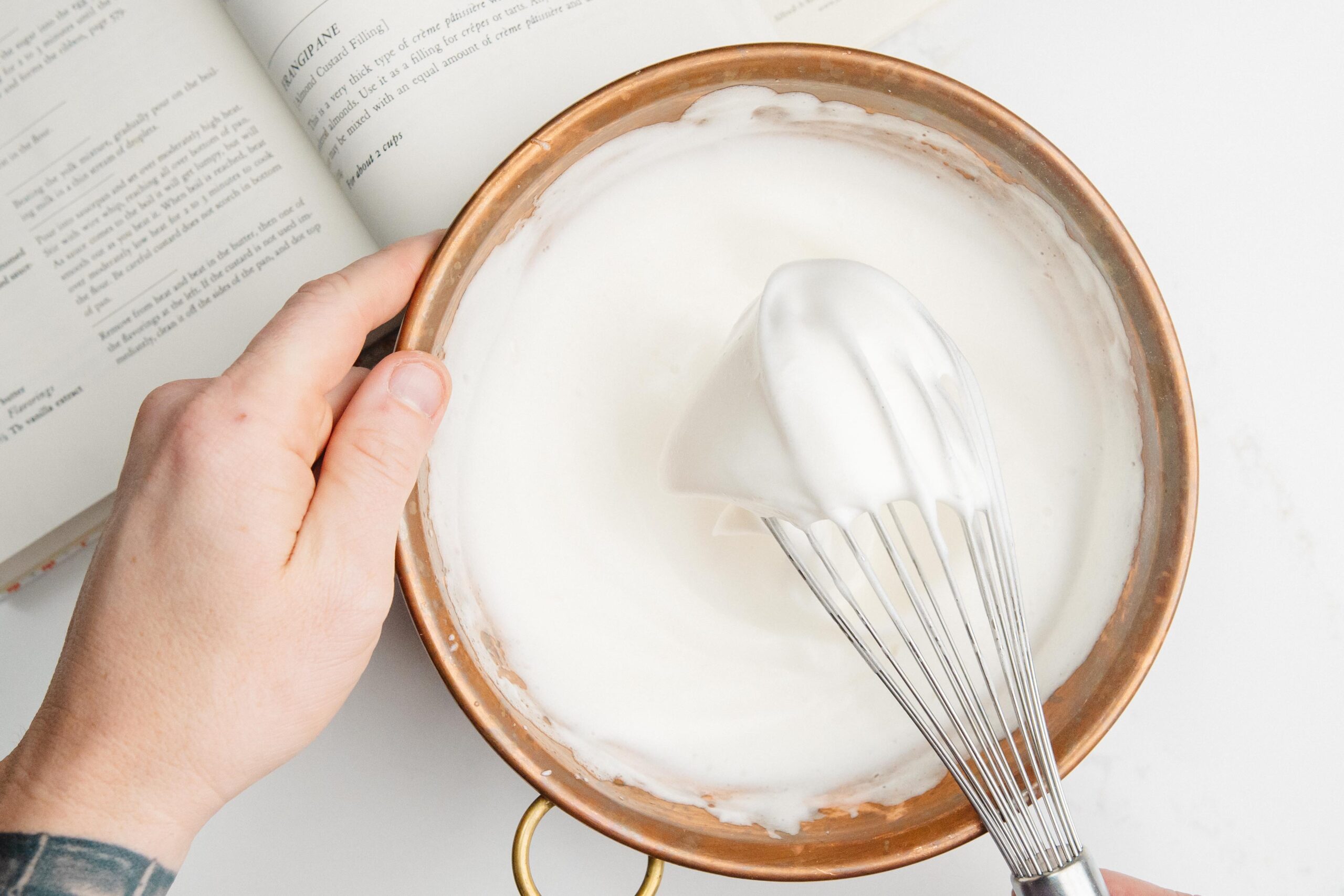 While your Crème Pâtissière is complete, now whip together your egg whites by hand or most easily with a machine. When the egg whites have reached a soft peak stage, add your salt and your sugar and continue to whip together until stiff peaks have formed.