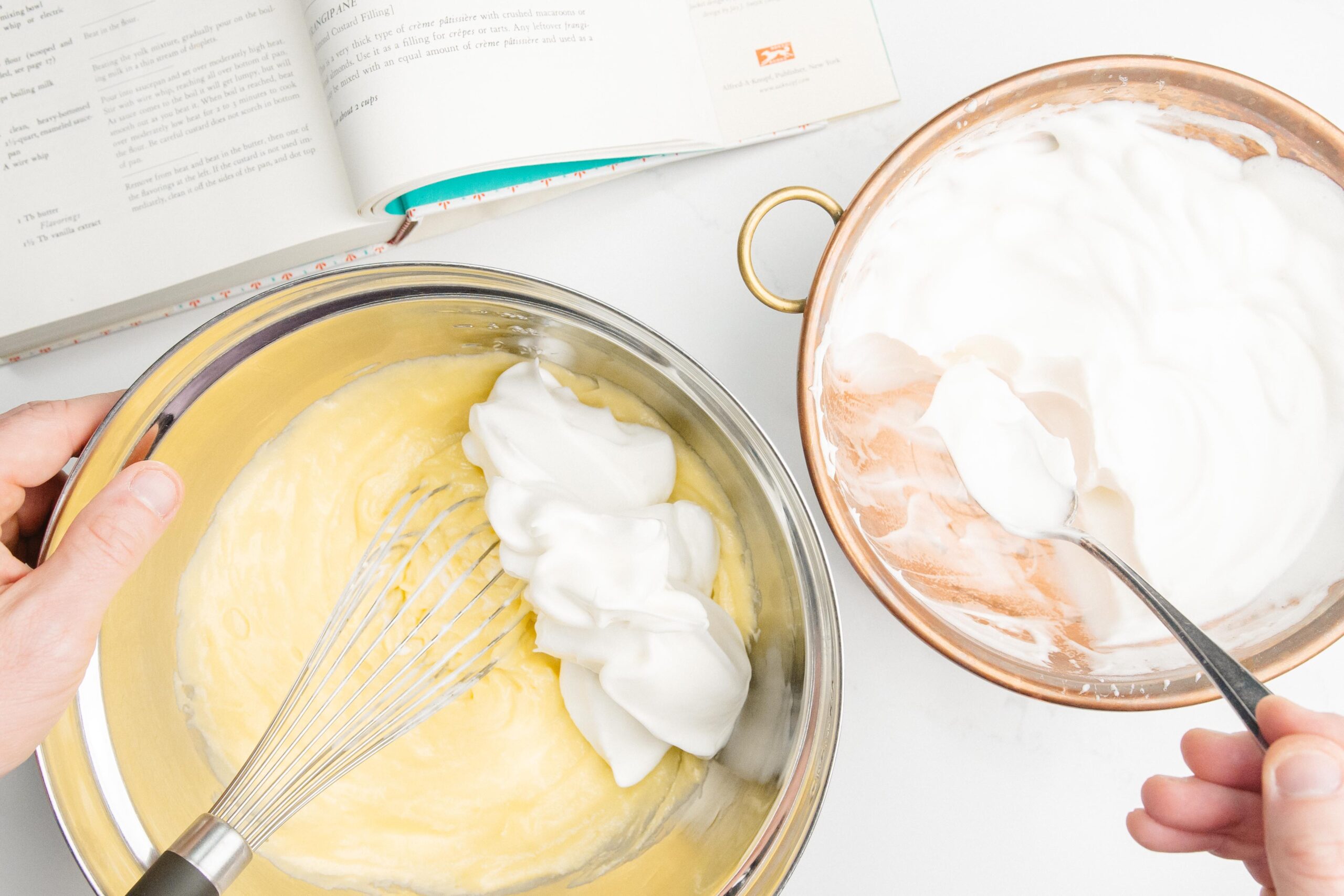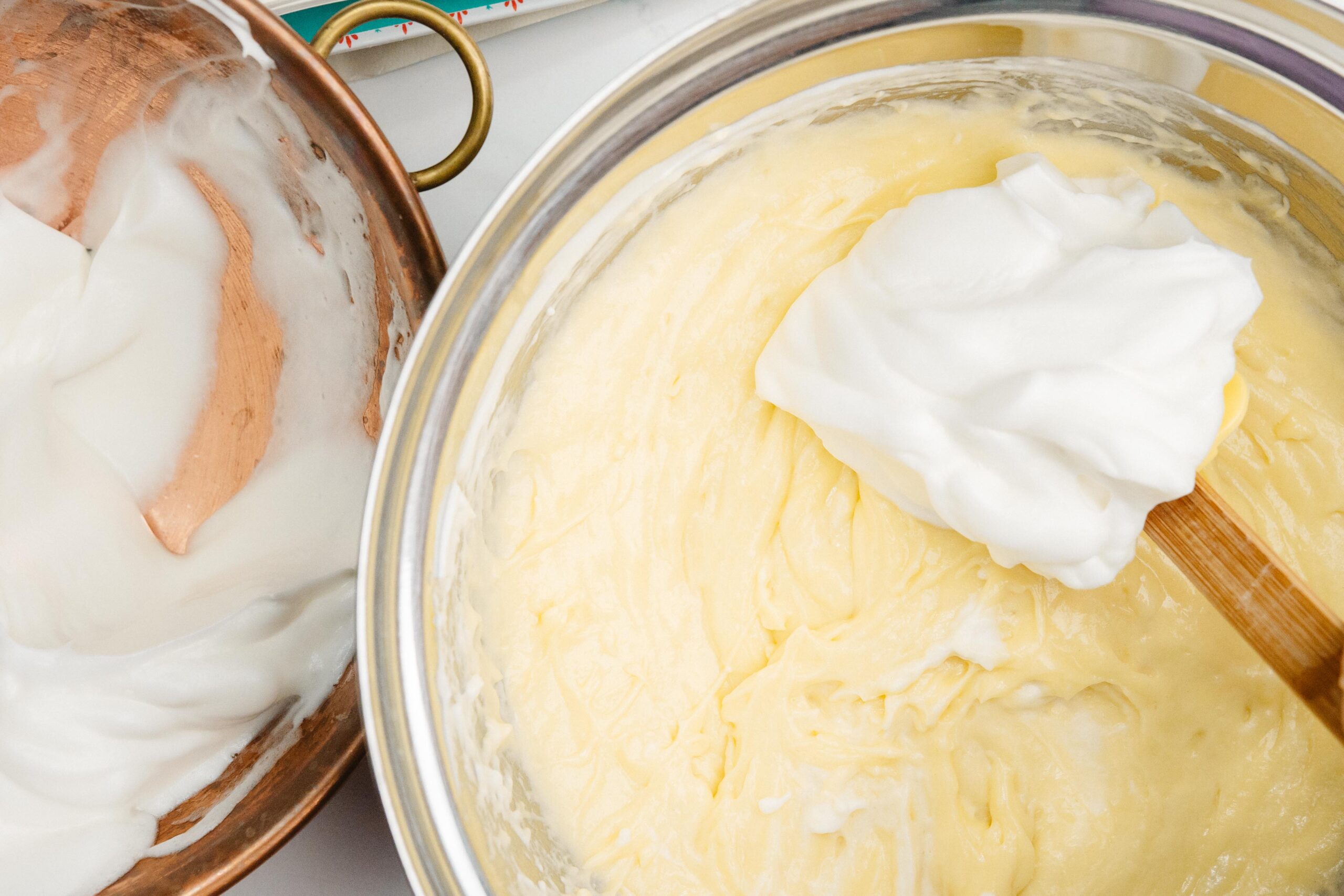 You can now fold in about 1/4 of the egg whites into the warm custard, folding to incorporate, and then gently fold in the rest.