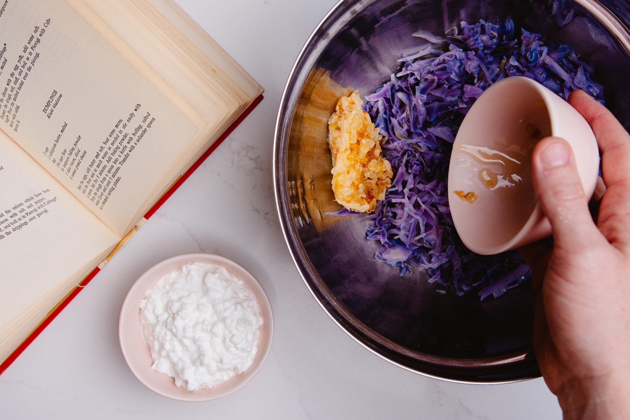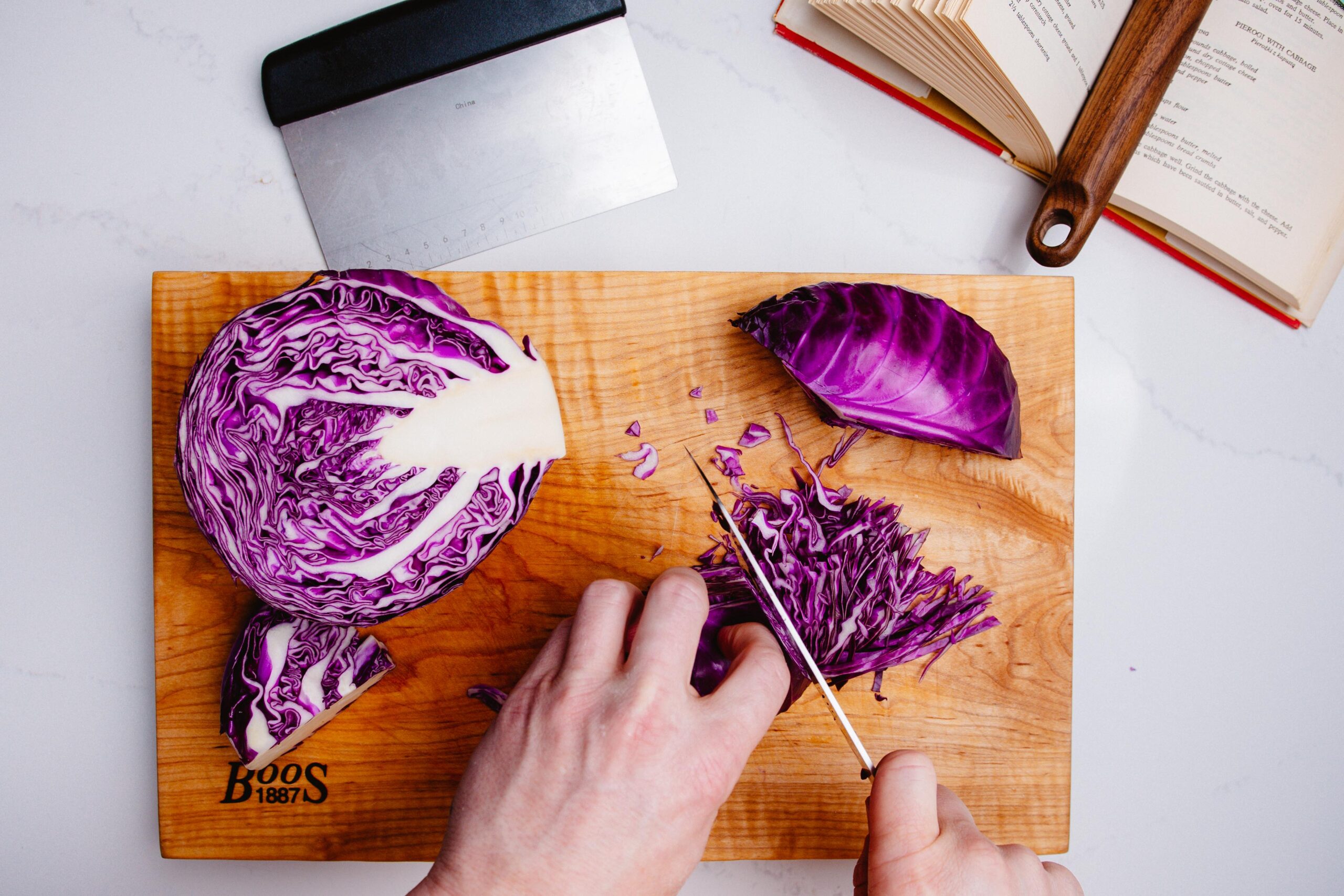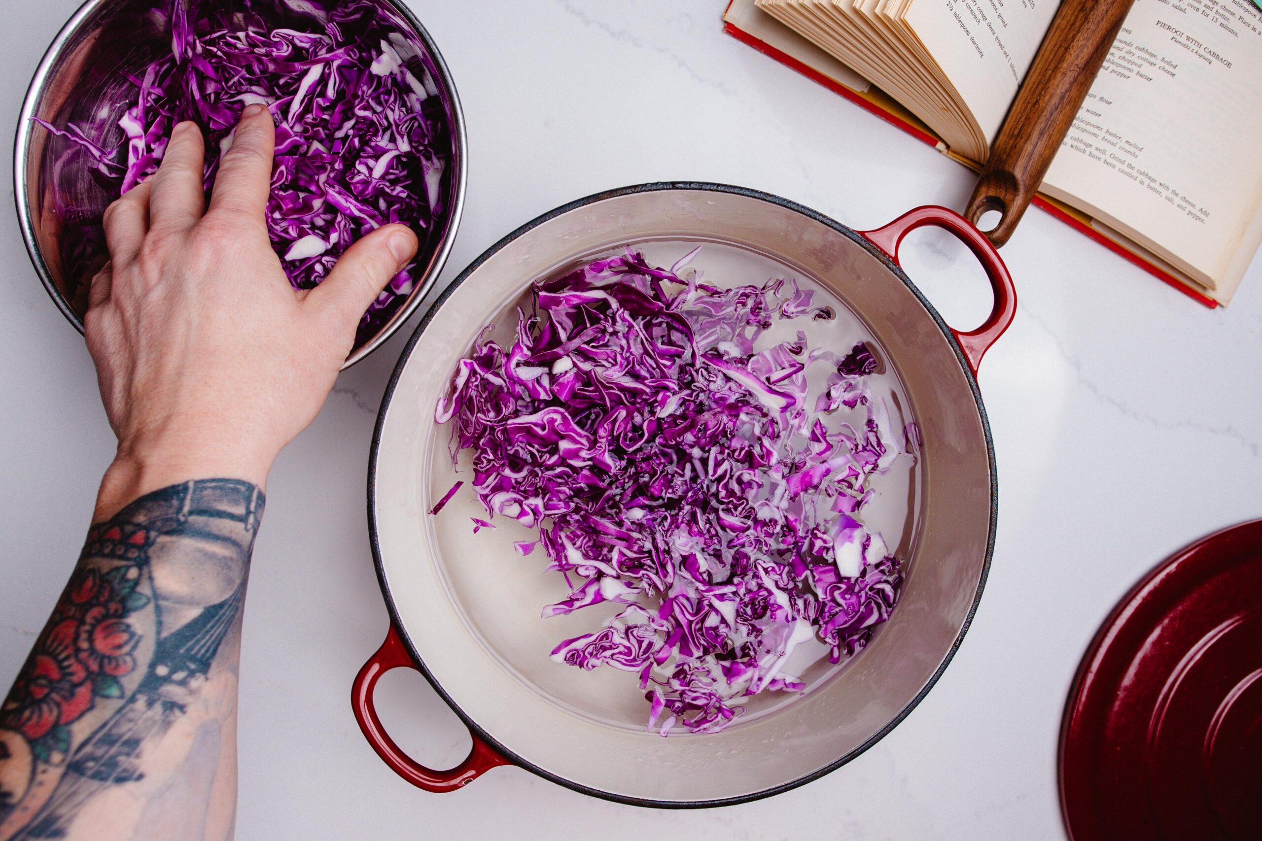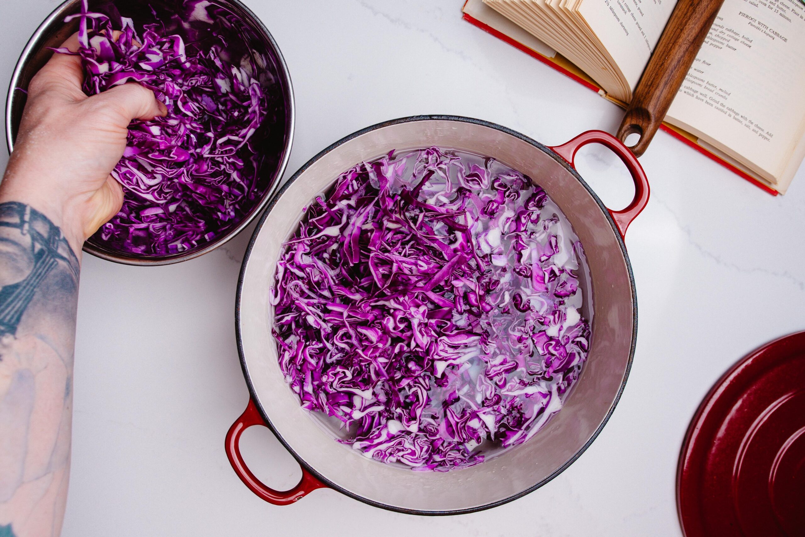 Finely shred a half head of Red Cabbage, like you’d see in a coleslaw, and then add to a large pot of salted, boiling water. Cover and allow to cook until tender, which should be between 8-10 minutes. It should have a little texture and not be mushy – just cooked through.