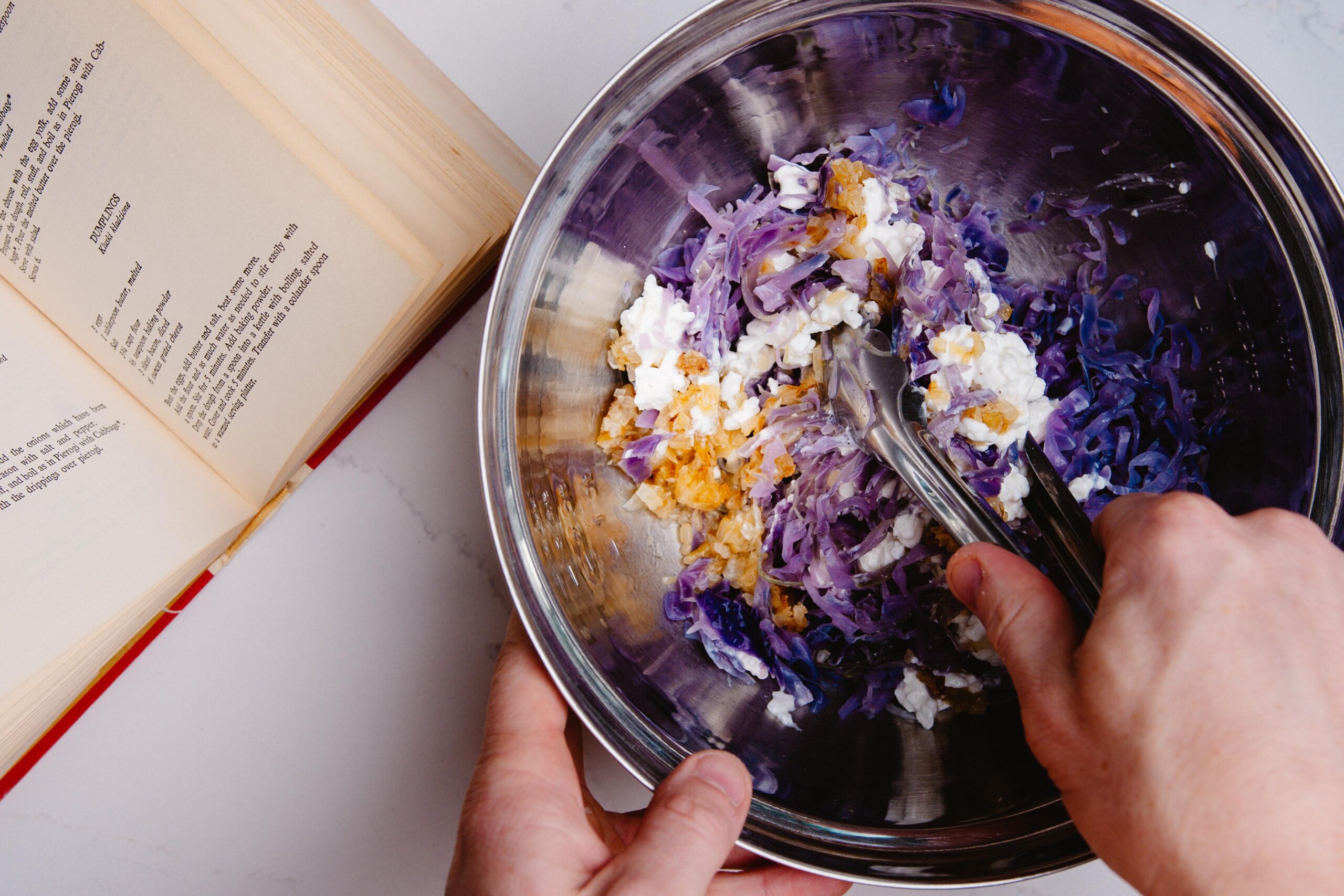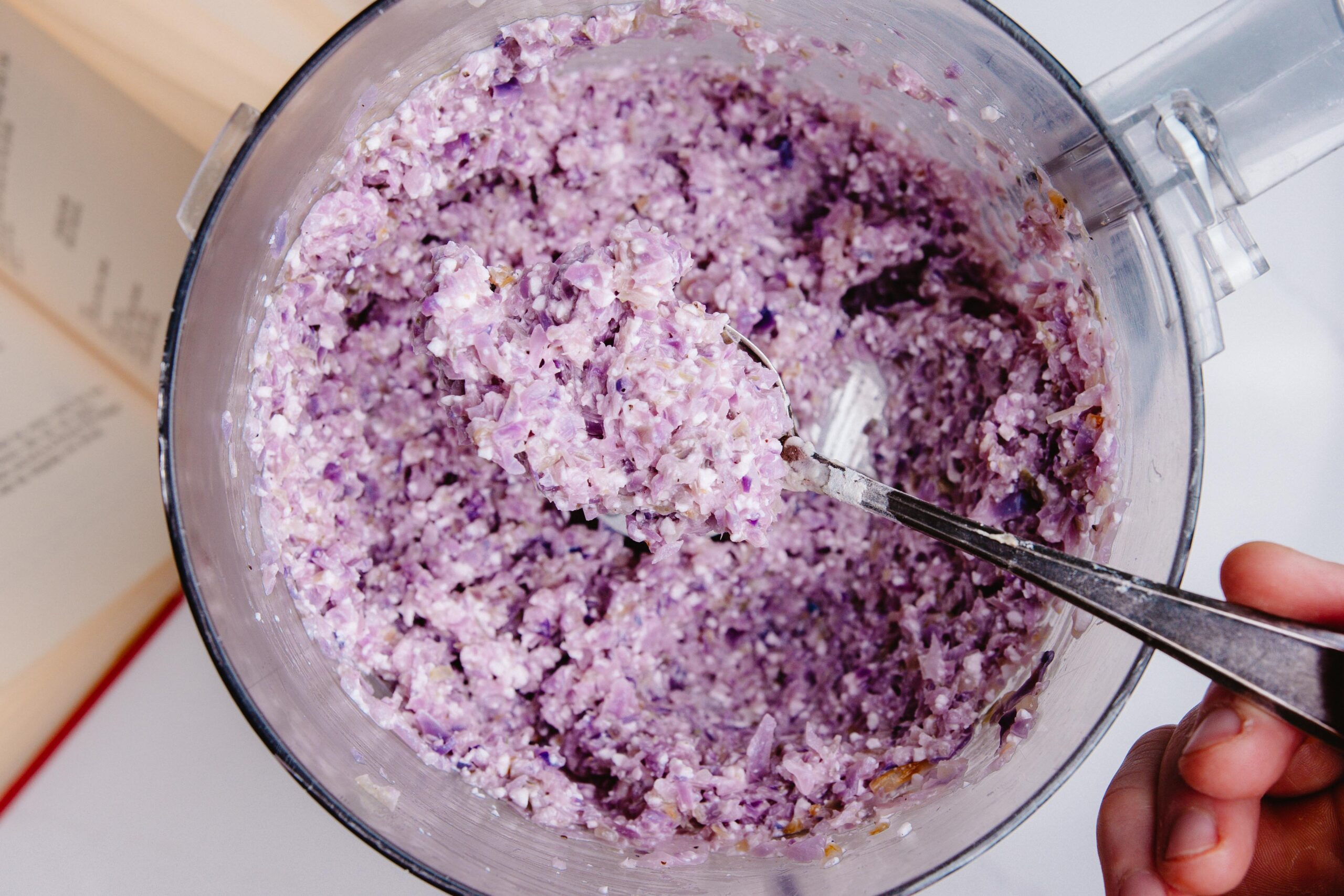 Once your onions are cooked and the cabbage has been removed from the water, place them all in a food processor, with the cottage cheese, and pulse briefly to just chop and blend everything together. It doesn’t need to be a puree, but should bind together.