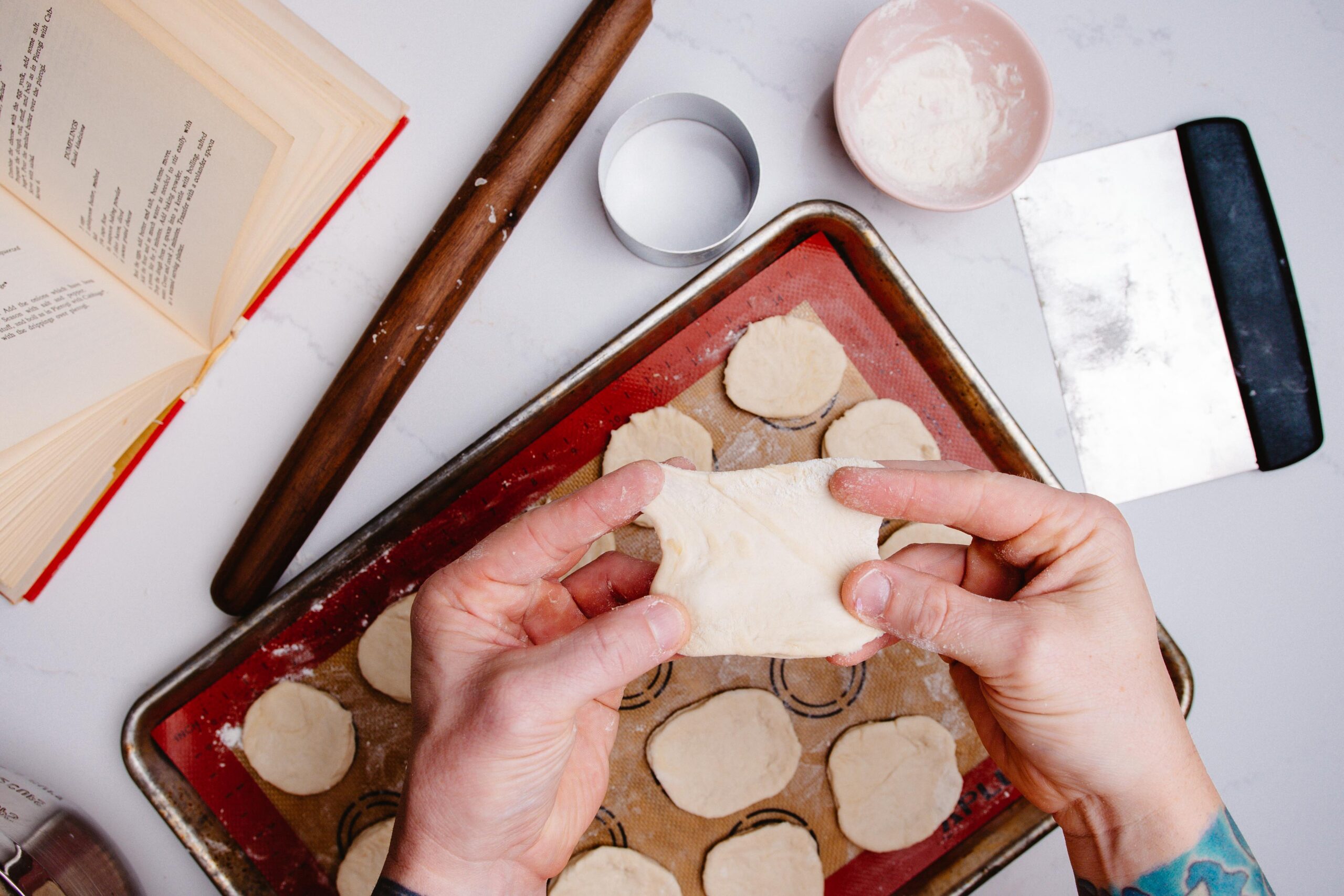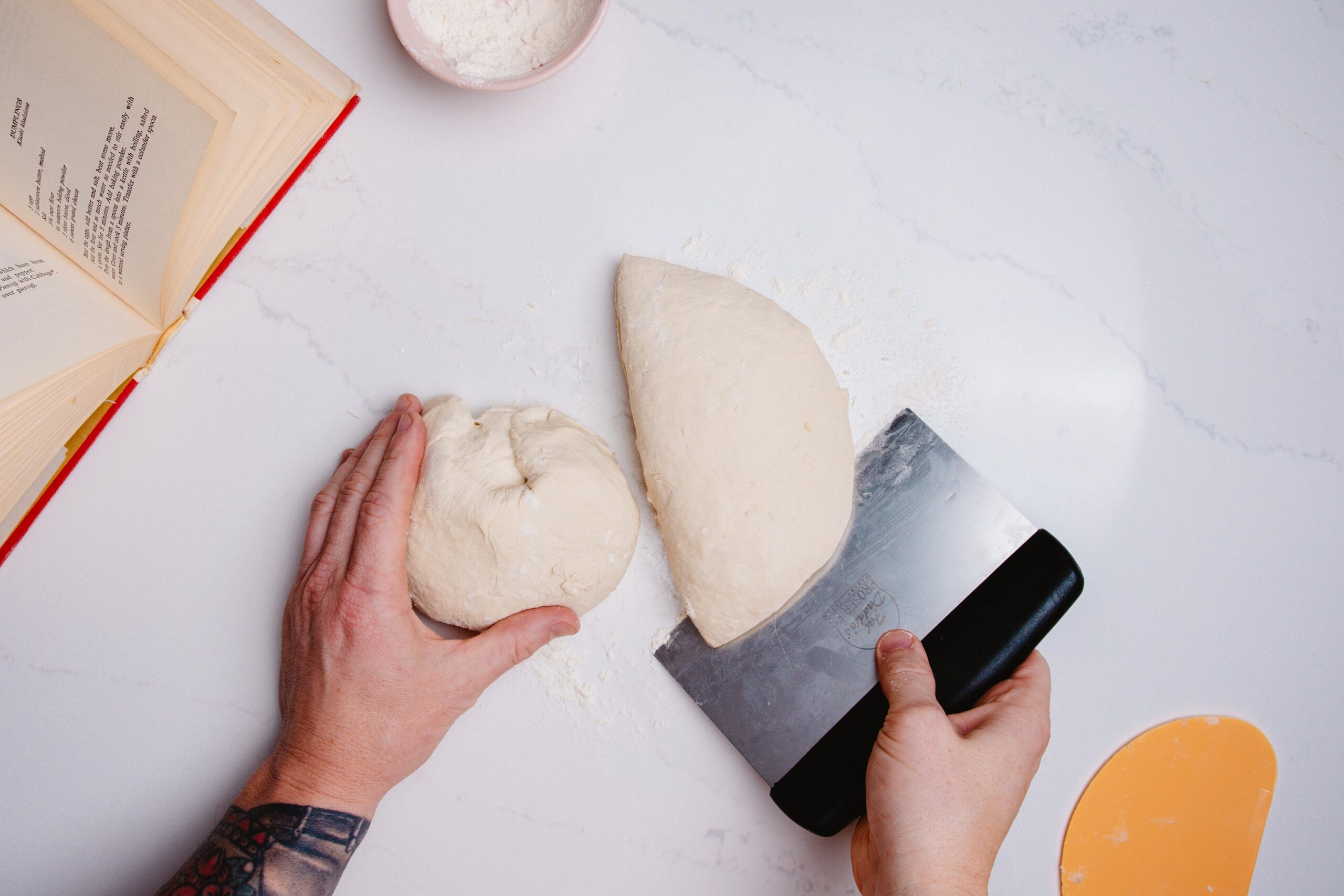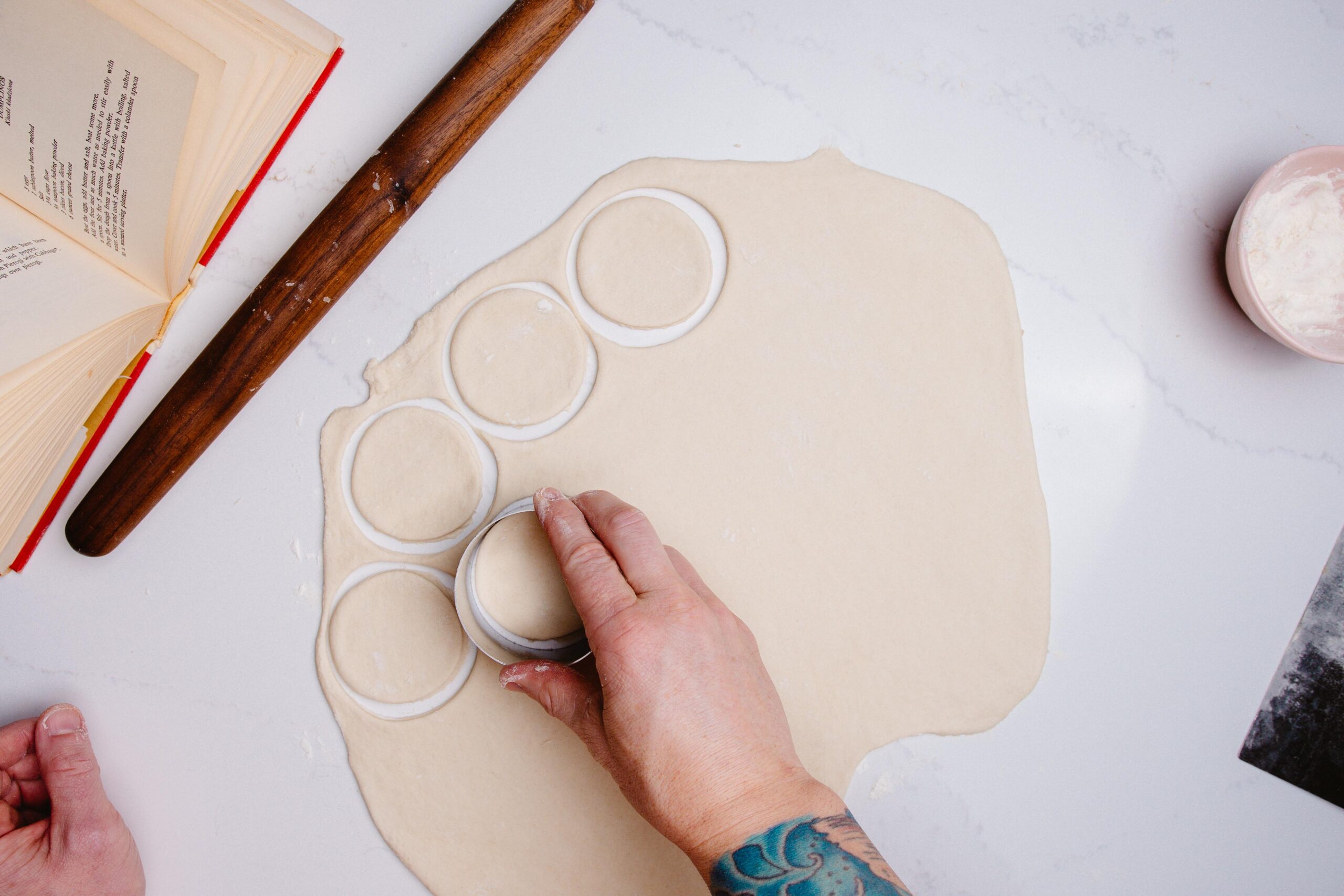 Now that the dough has rested, let’s use a Dough Cutter to split it into halves or quarters, keeping anything unused in the covered bowl, so they don’t dry out. You can use a rolling pin to simply flatten the dough to about the size of a few credit cards stacked together (maybe 1/4 inch thickness) and using a circular dough cutter, punch out circles of dough (or squares, it doesn’t really matter).