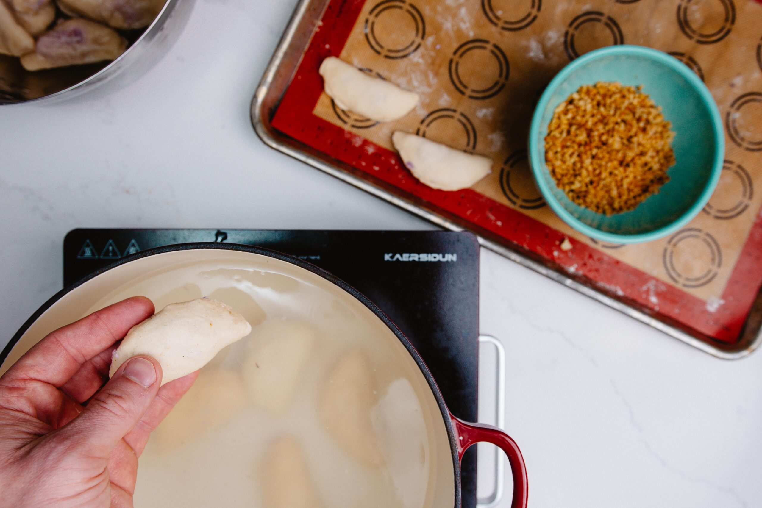 Once your dumplings are finished and frozen, bring a large pot of salted water to a rolling boil, add your desired amount of Pierogis in and cook until they float!