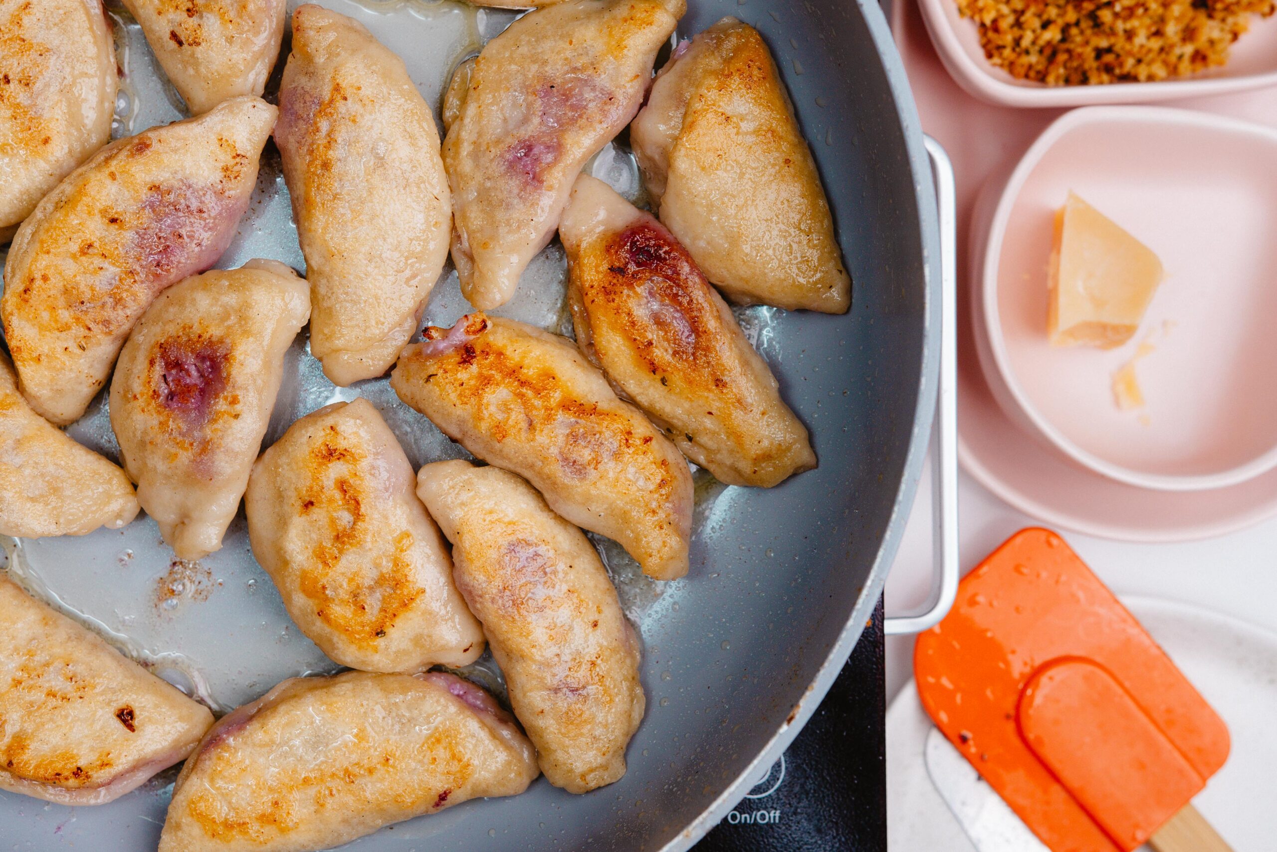 Once they’re floating (about 4-6 minutes) you can remove them with a colander and pan fry them with some oil and butter over medium heat until they’re crispy and browned. The best trick to ensure a beautifully golden pierogi is to either dry them on a towel first or allow them to gently cook, undisturbed, until the water has mostly evaporated. Periodically check your dumplings before flipping them and remember that generally the center of the pan will cook faster than the outside, so rotate your pierogis halfway.