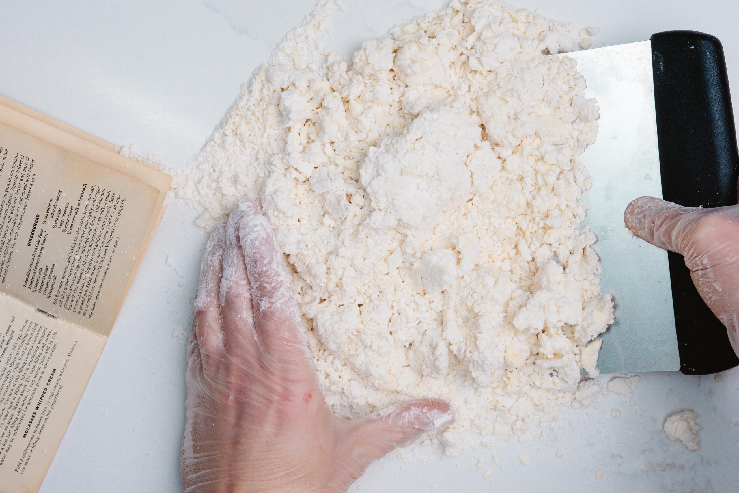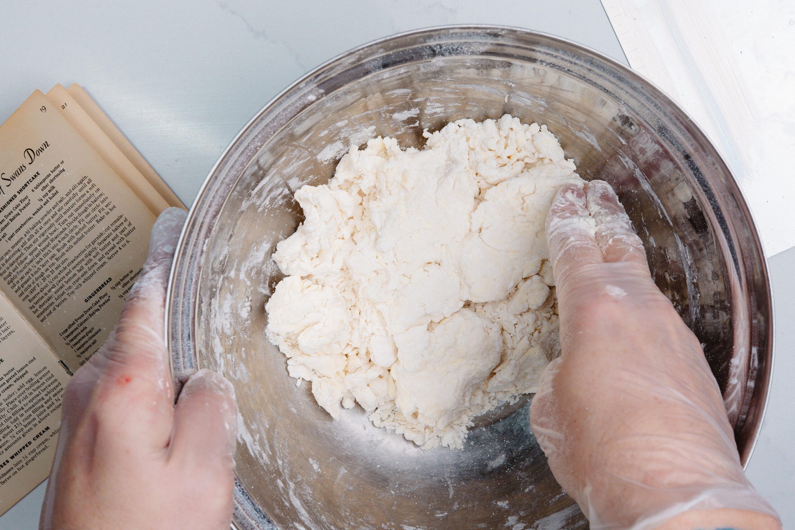 After grating the butter, toss together with the flour and then add all of your milk. Quickly mix together by tossing the flour to form a “Shaggy Dough.” It will be very dry and flakey – this is good.