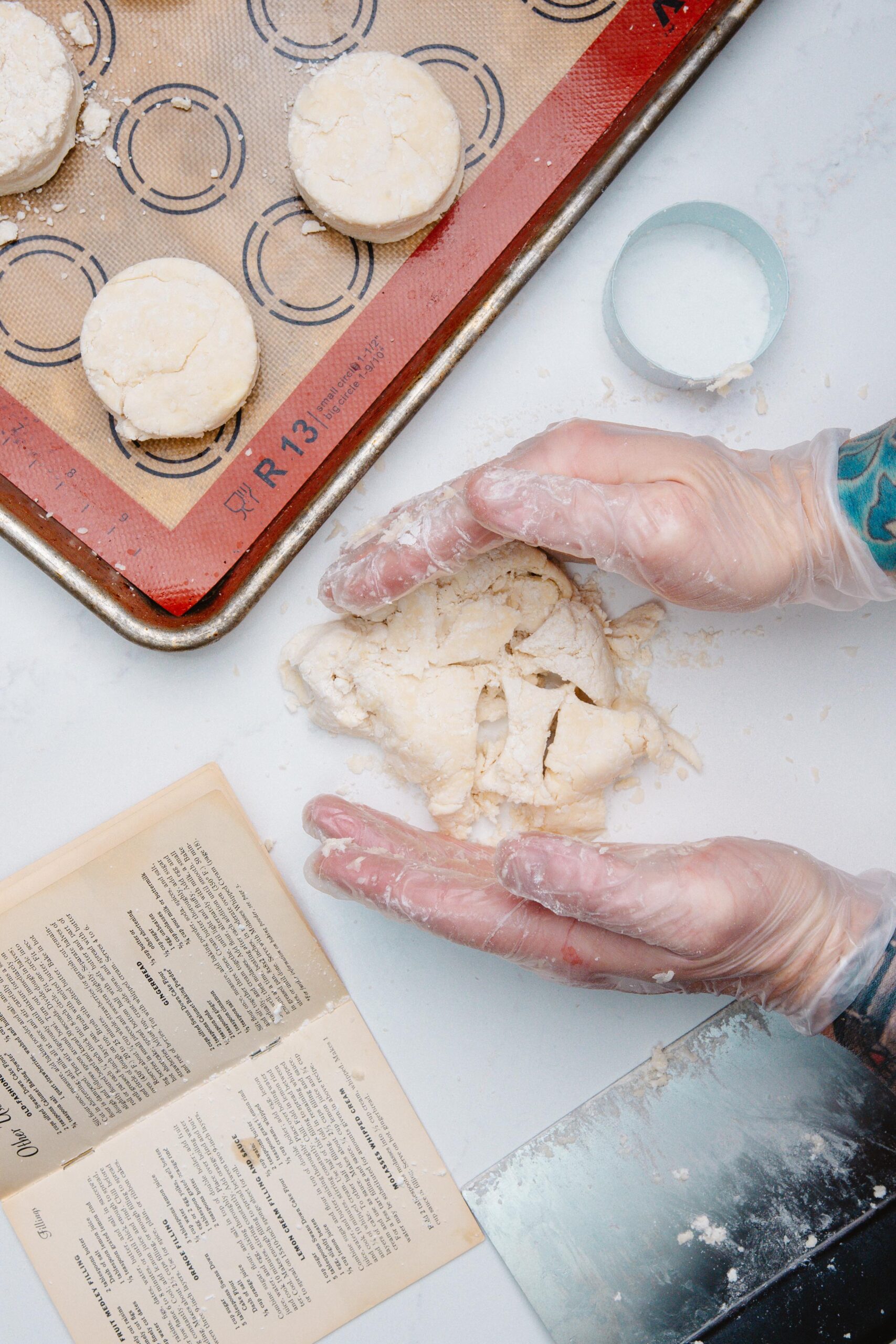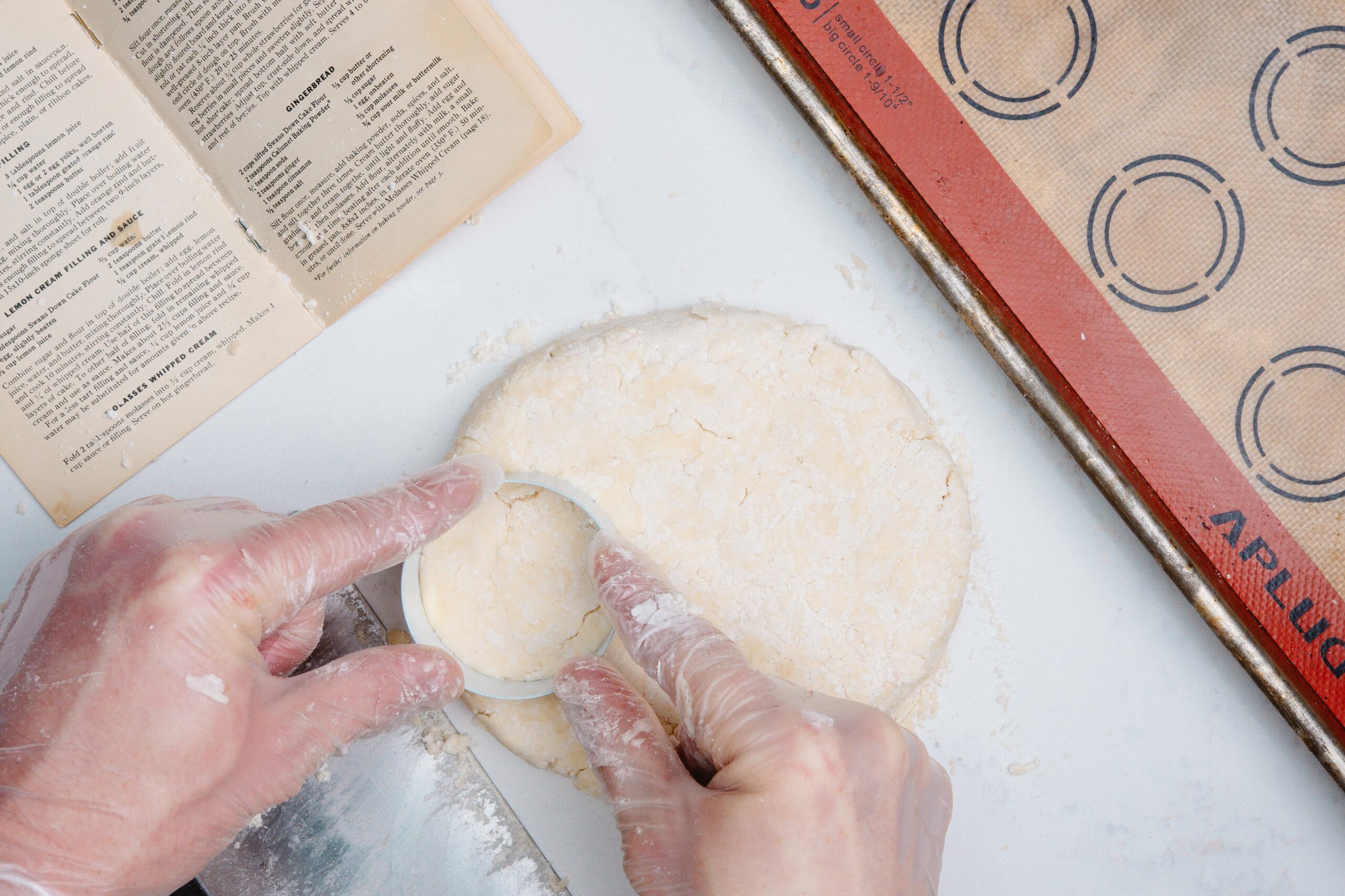 Gently press your dough down to form a thick “Coin” that is about an inch or two tall, then with either a circular cutter or a knife, cut the dough and place on a baking tray.