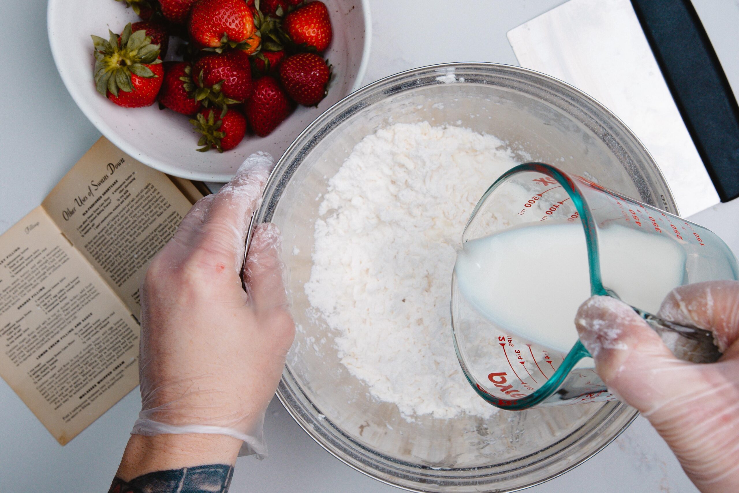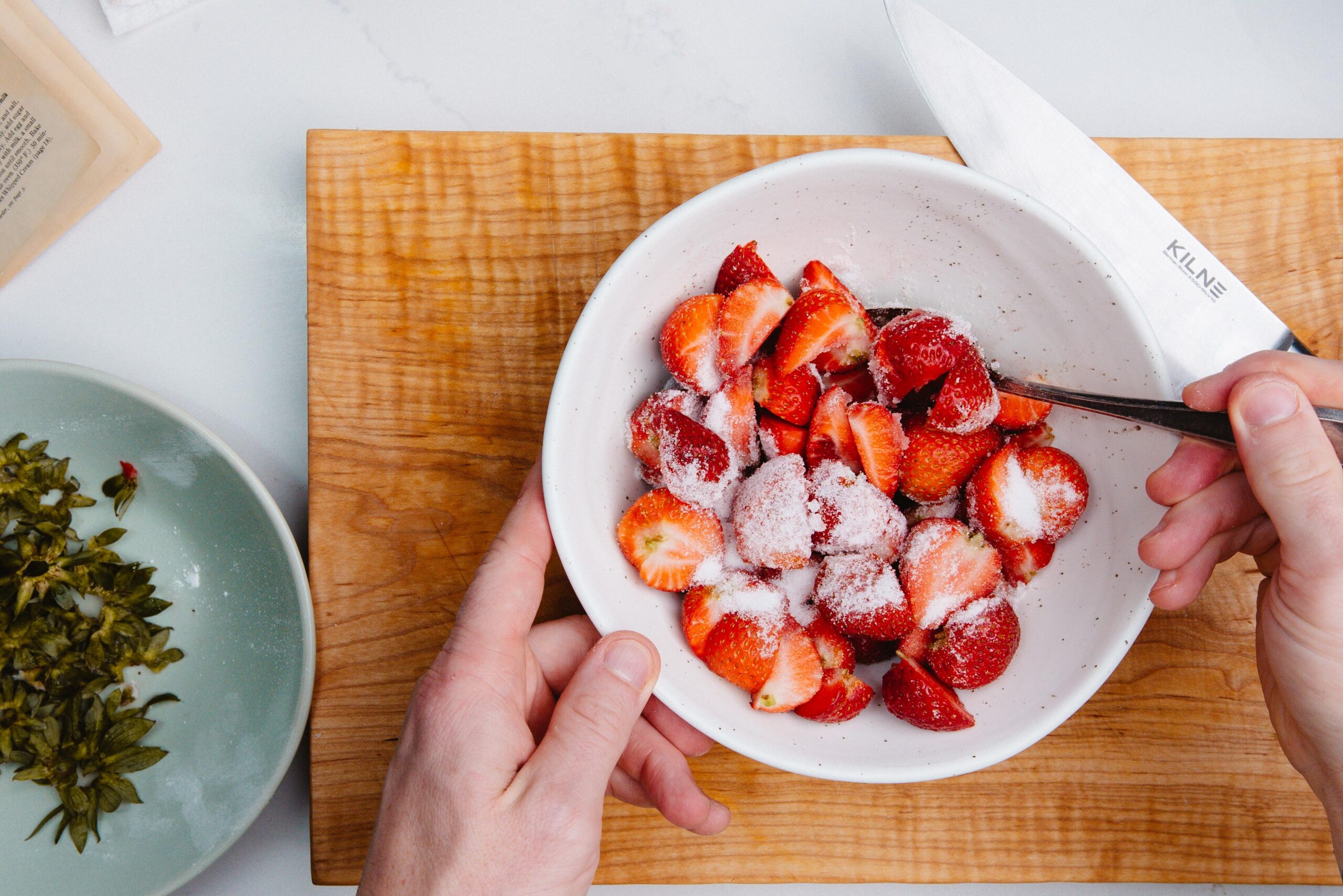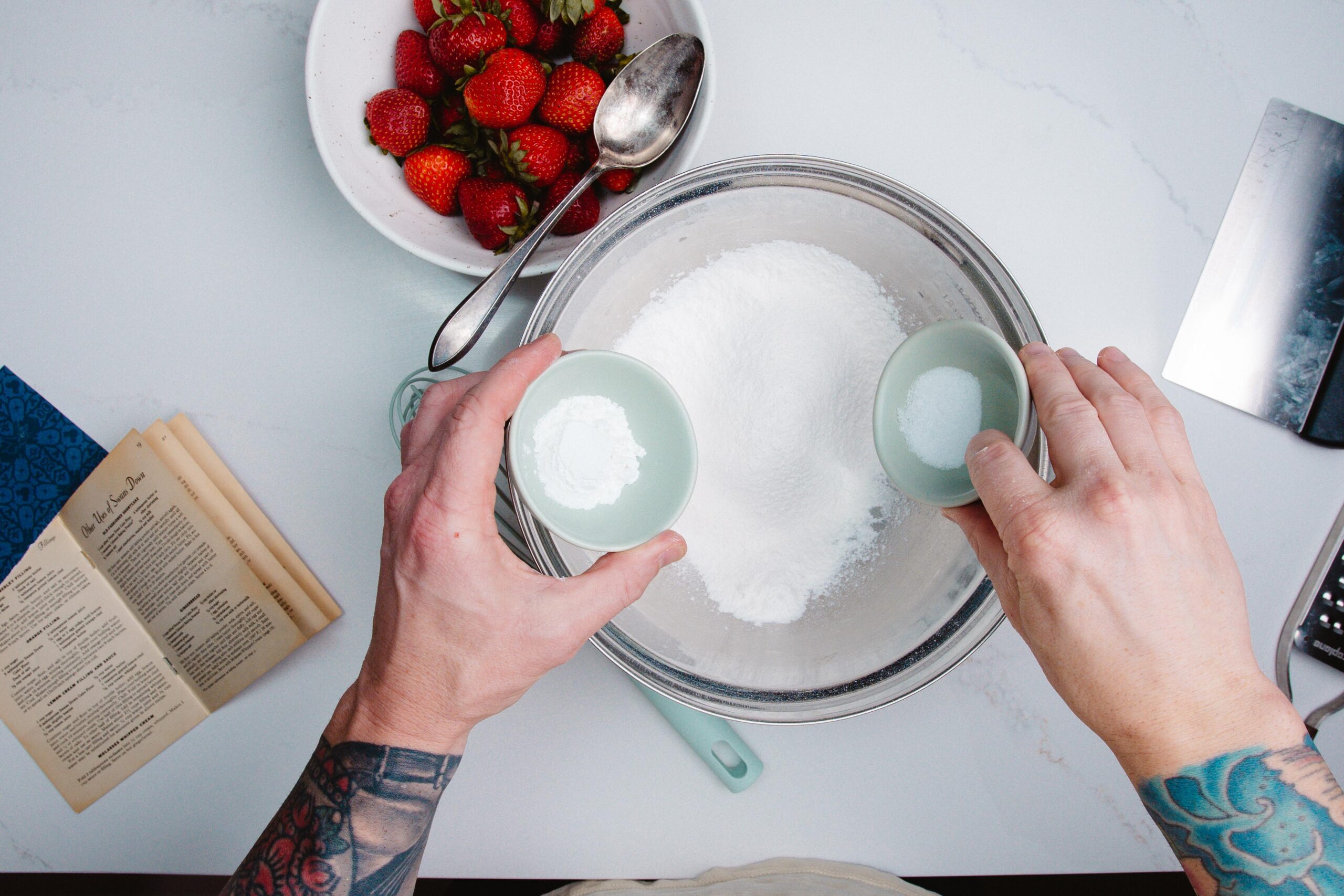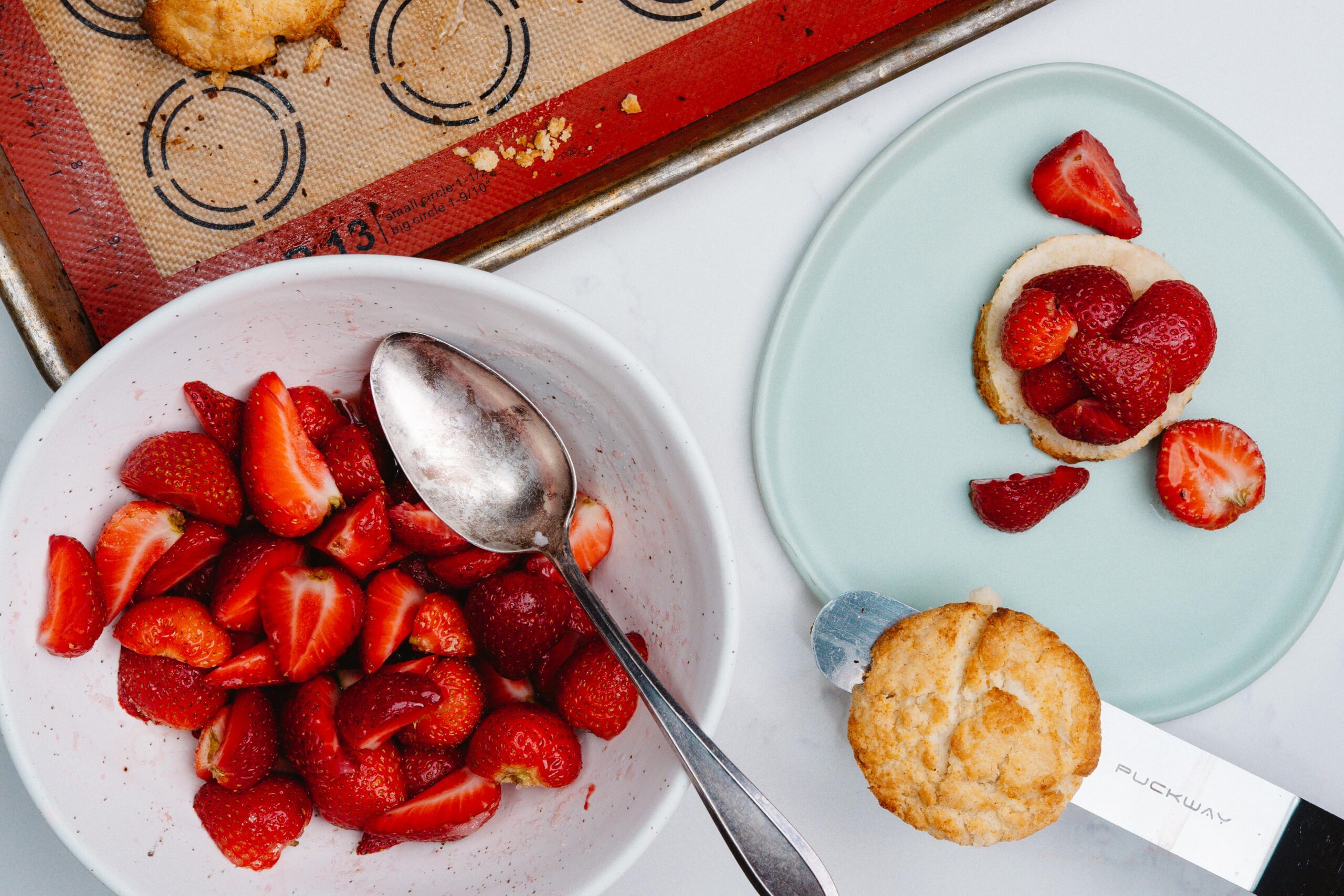 Spoon a few tablespoons of sugar onto the cut strawberries and toss them around, allowing them to sit in the sugar until you’re ready to plate. This is called macerating and the sugar will help draw out excess moisture from the berries, while also intensifying their flavor. By the time your Shortcakes are done, the strawberries will be ready, but this can be done a day in advance for the best results.