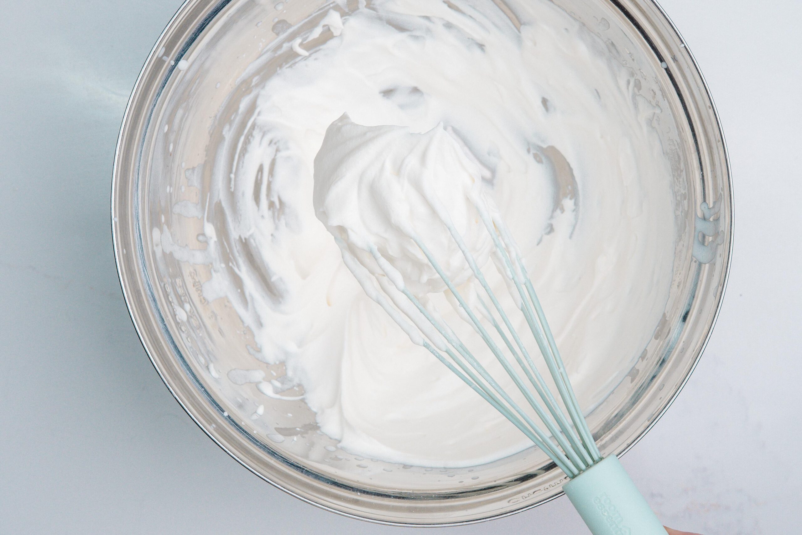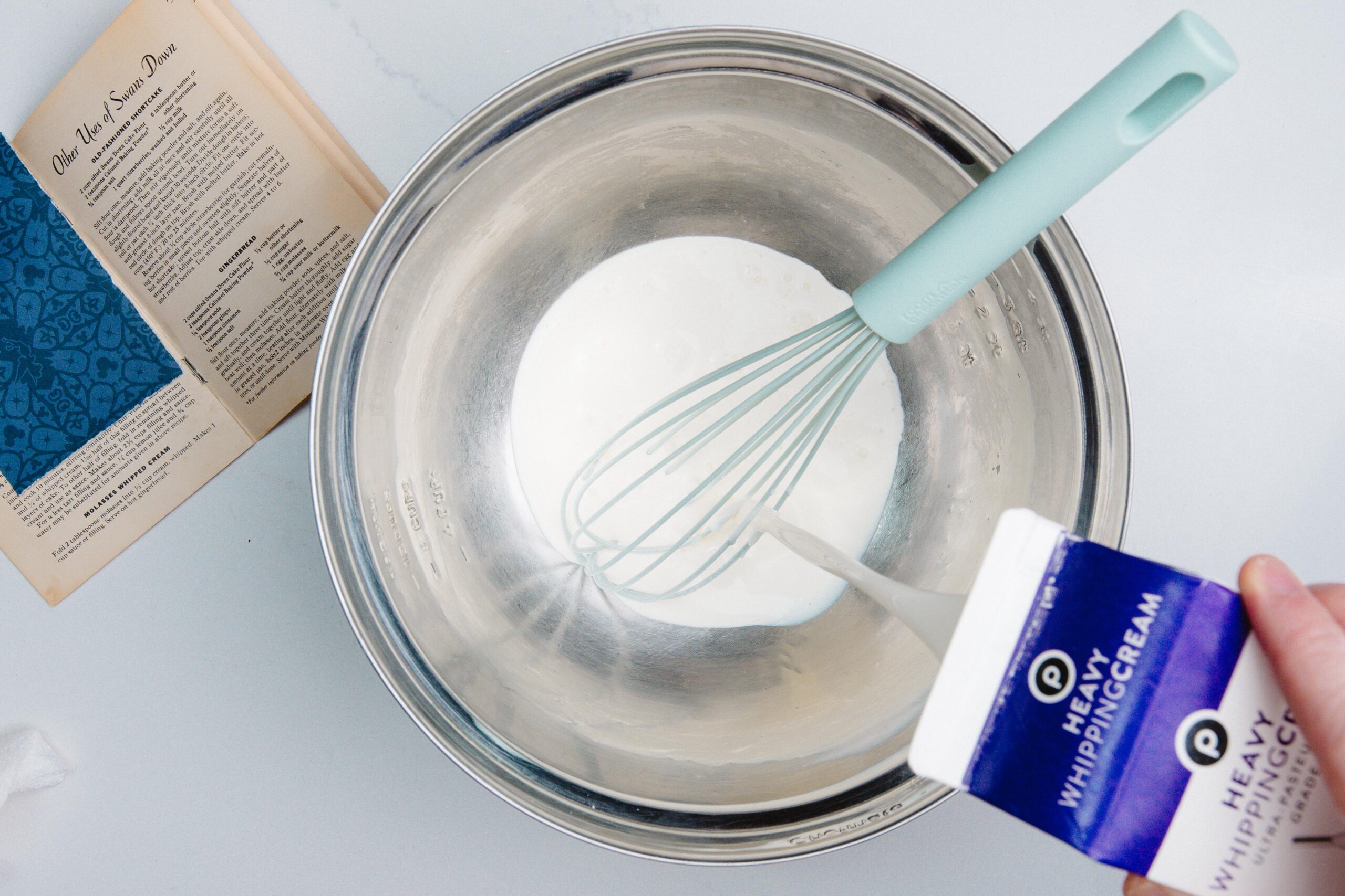 Now add about a half cup of heavy cream in a mixing bowl and with a balloon whisk, quickly whip your cream until it begins to thicken. At this point, if you’d like it slightly sweetened, add a couple tablespoons of powdered sugar and some vanilla extract or other flavors. Continue to whisk until the cream holds on the end of the whisk, but careful not to take it too far, or you’re making butter.