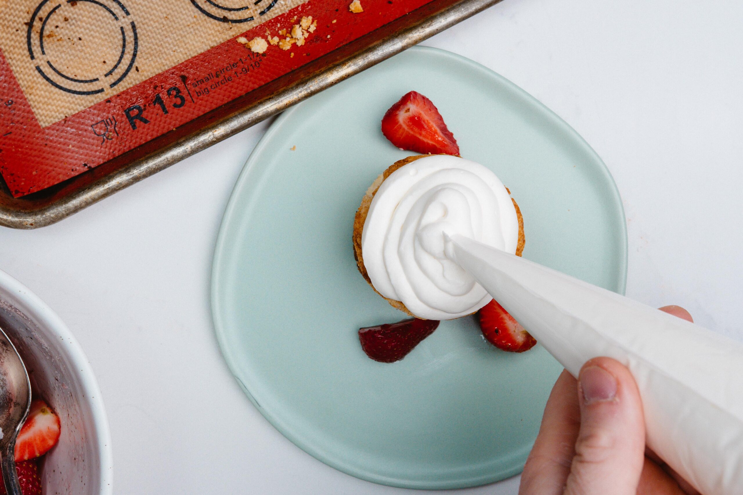Generously top the bottom half with the macerated strawberries, top it with the other half and bury it in the freshly-made whipped cream. Give it a little Strawberry Hat and you’re done!