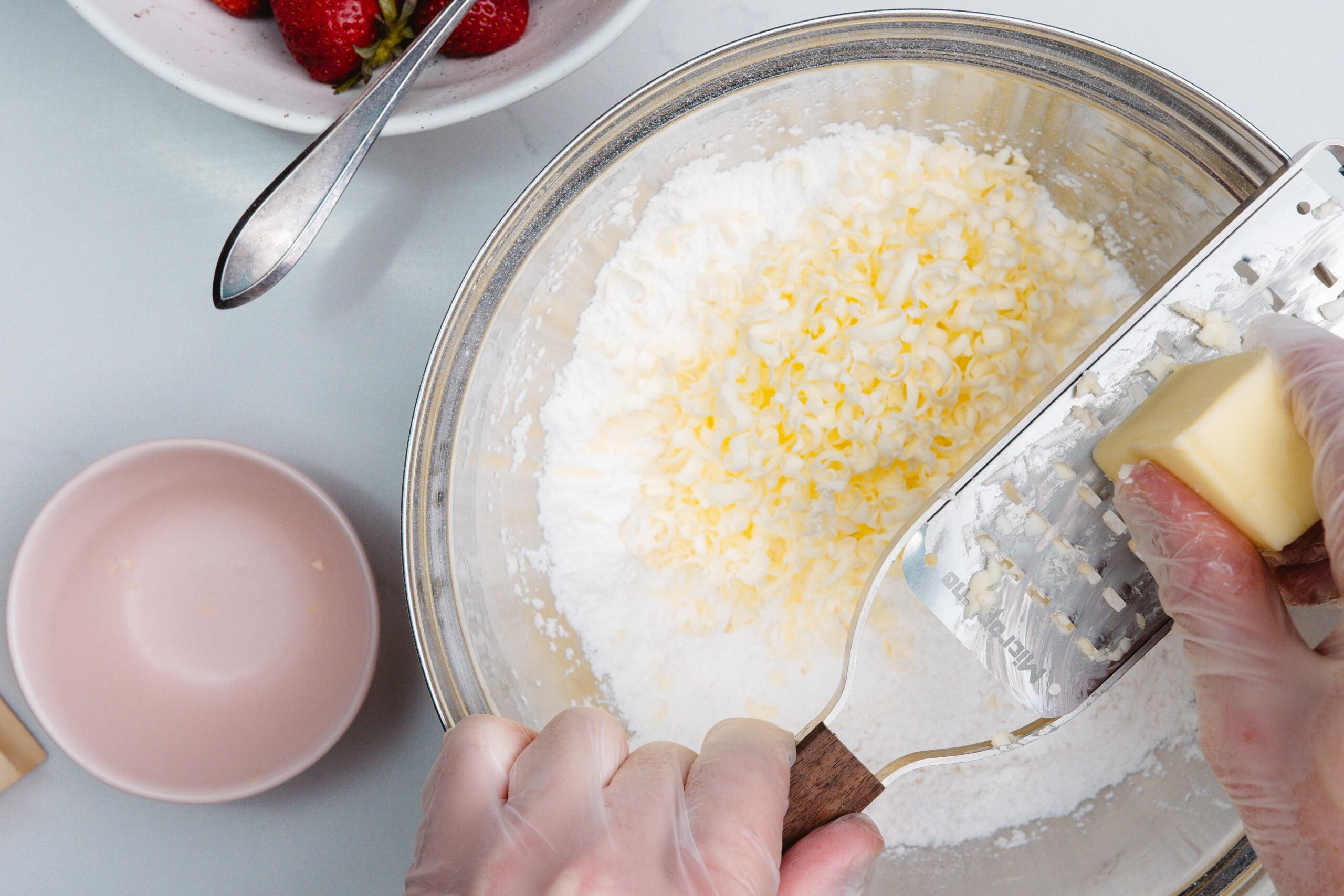 • I recommend taking a stick of butter and freezing it for an hour or two. Once it’s totally firm you can very easily grate it into your flour with a box grater, rather than using a dough cutter or warm hands. The objective is to handle the butter as little as possible, to prevent the butter melting.