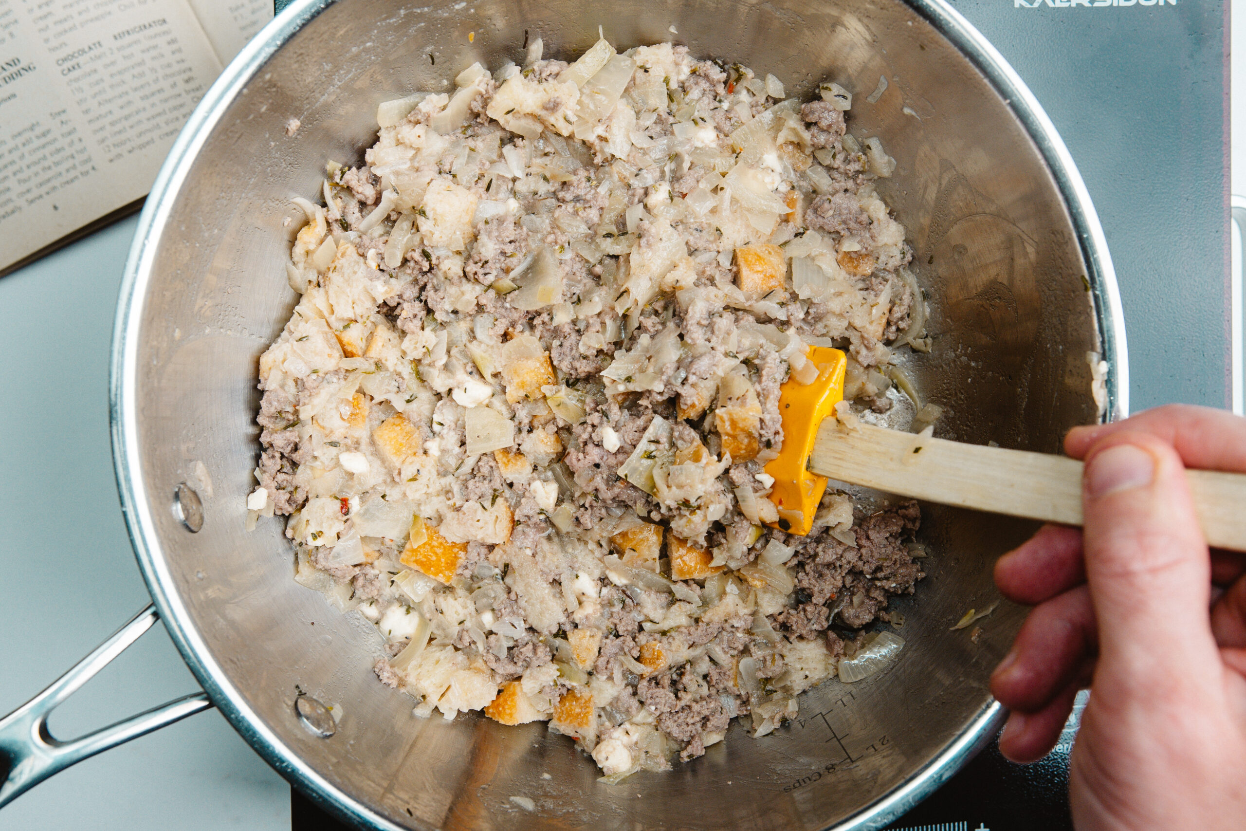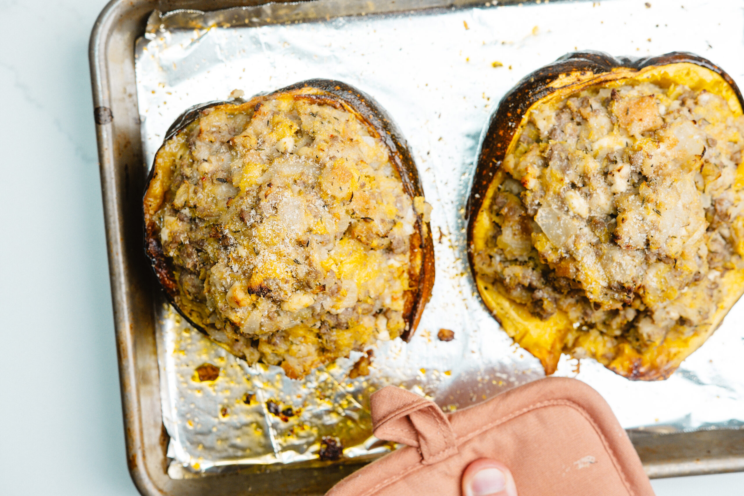 Carefully using tongs, use a spoon to scoop the inside of the squash out and combine with your onion and bread mixture until well incorporated. Scoop back into the Acorn Squash and stuff generously. Then top with more breadcrumbs and return to the oven to brown, about 5 minutes.