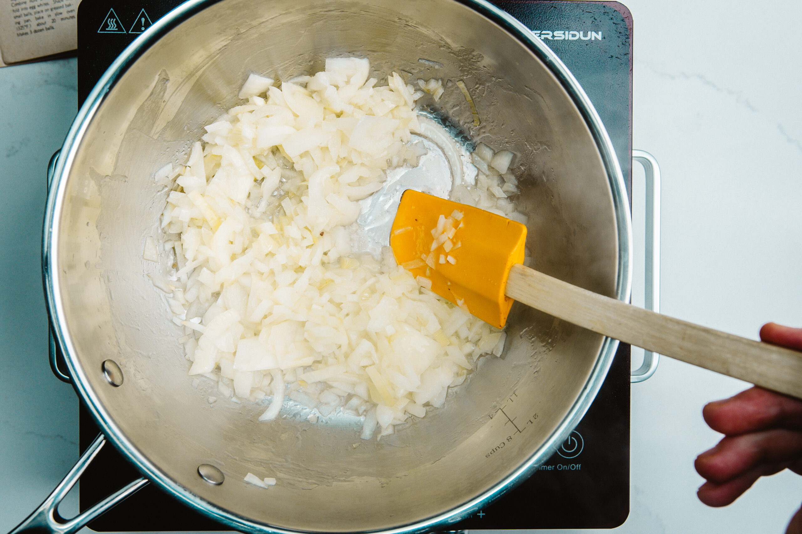 While that is roasting, dice your onion and begin to gently cook over medium heat, covered, until translucent (sweated). You can add some water to your sauté pan, which will help to cook the onions down a bit faster.