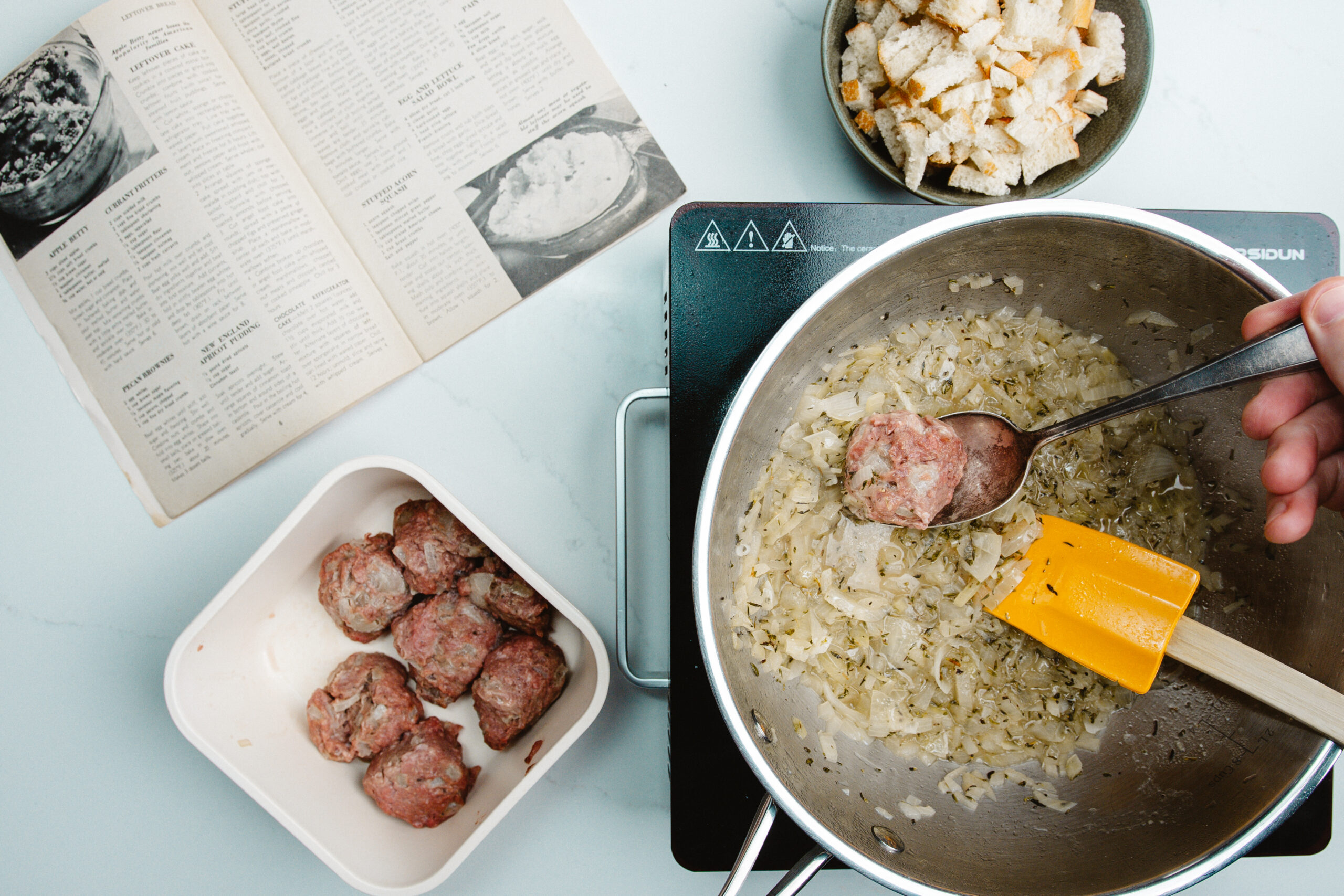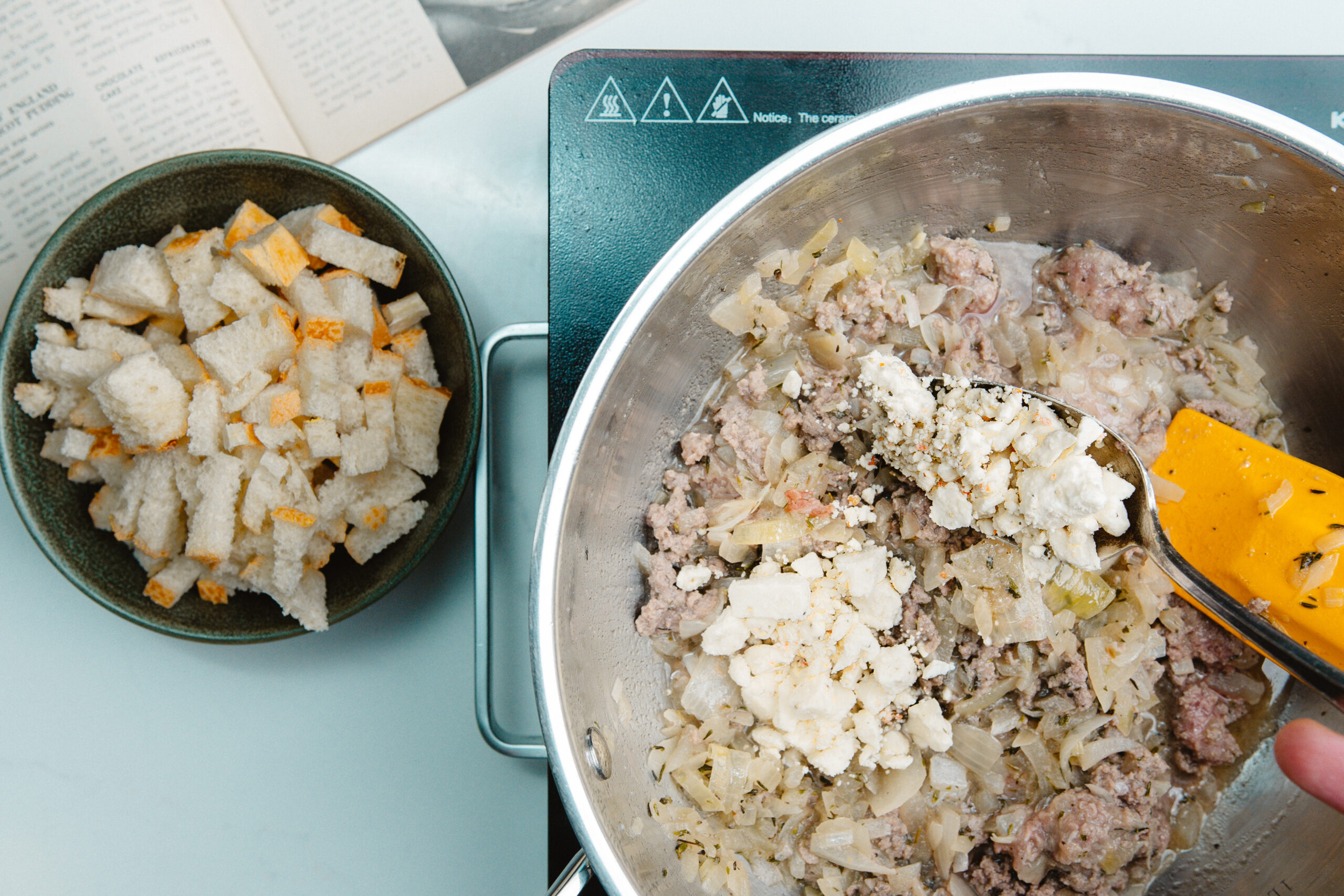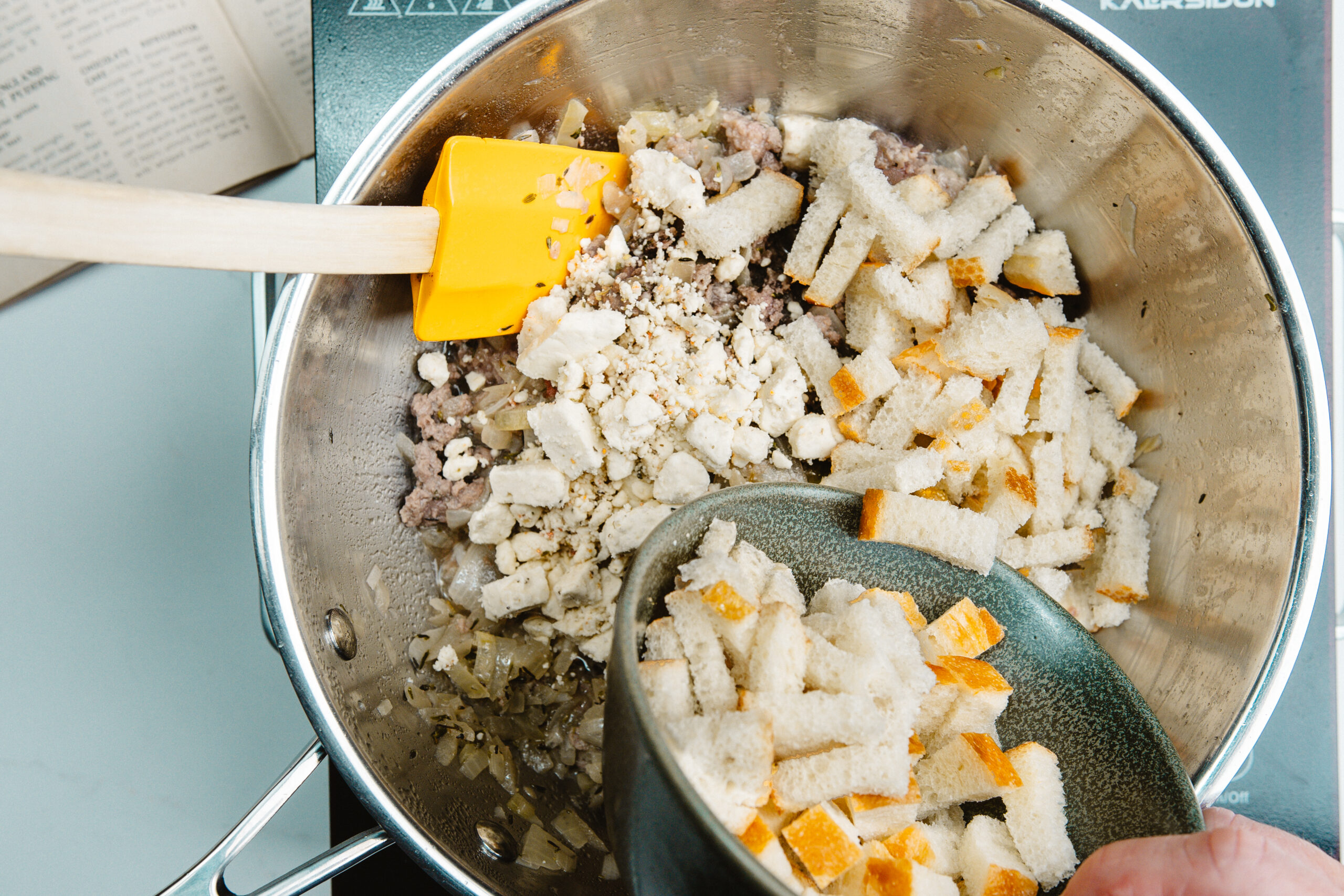 Now cut your bread into small chunks or process in a food processor. Transfer the breadcrumbs into a mixing bowl along with your cooked onion mixture.